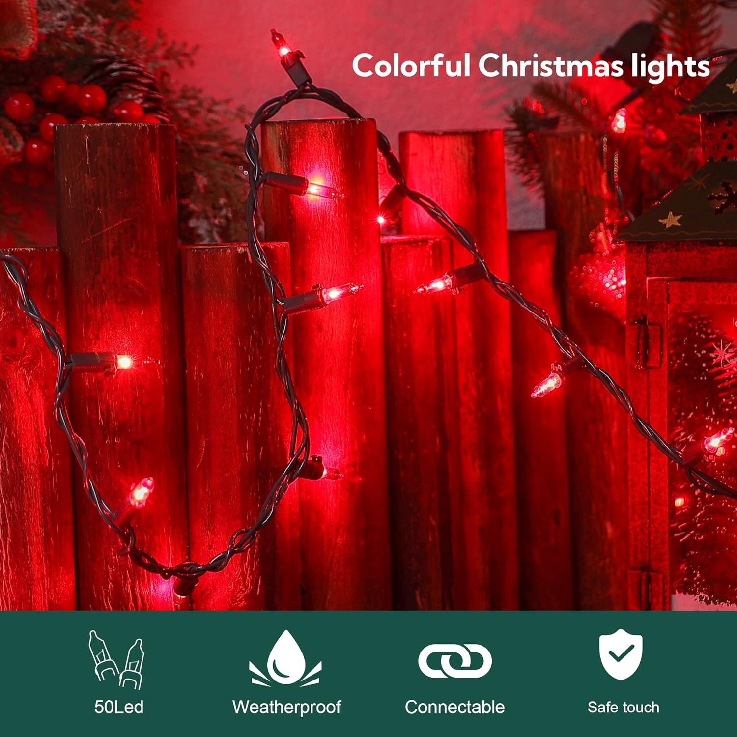 - 🎀Safe to Use : 50count Red Christmas string lights are UL certified and the quality is guaranteed. Our Christmas strings lights have built-in fuses, which will protect the short circuit caused by the damaged wire and can effectively prevent the possibility of fire. High quality use rest assured. Warm tips: Please kindly protect these string lights from immersing in water and keep the plug dry.