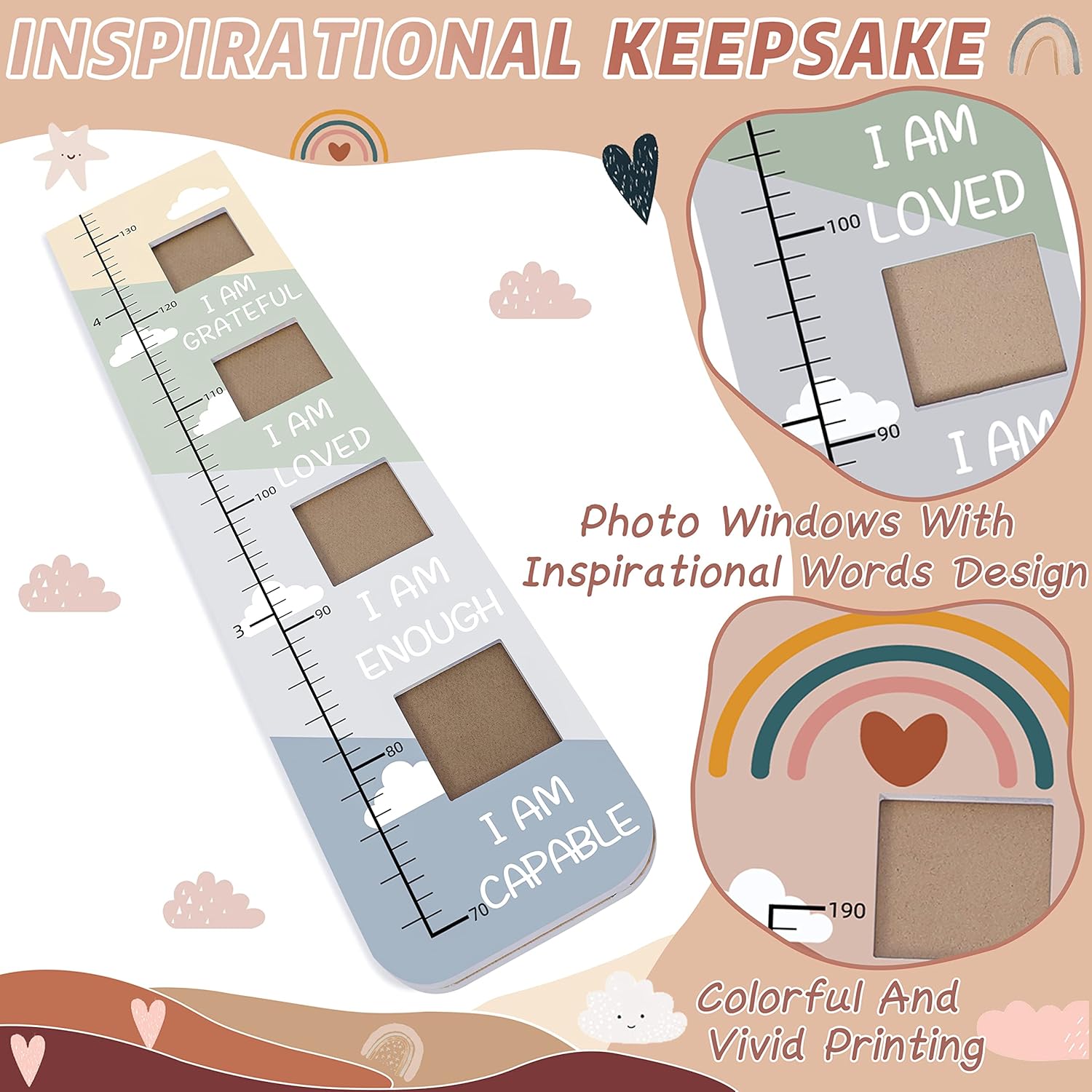 - ❤️【Grow With Encouragement】This height measurement for wall is printed in rainbow colors with elegant boho style, designed with some uplifting and inspirational quotes. It has 8 photo frames, each window freezes a moment of your child's growth and tells the story of your kids. It's like a book of your childs, leaving a unique and eternal memory. This inspirational wall art will not only help to make kids' rooms more interesting but also encourage your children to believe in themselves.