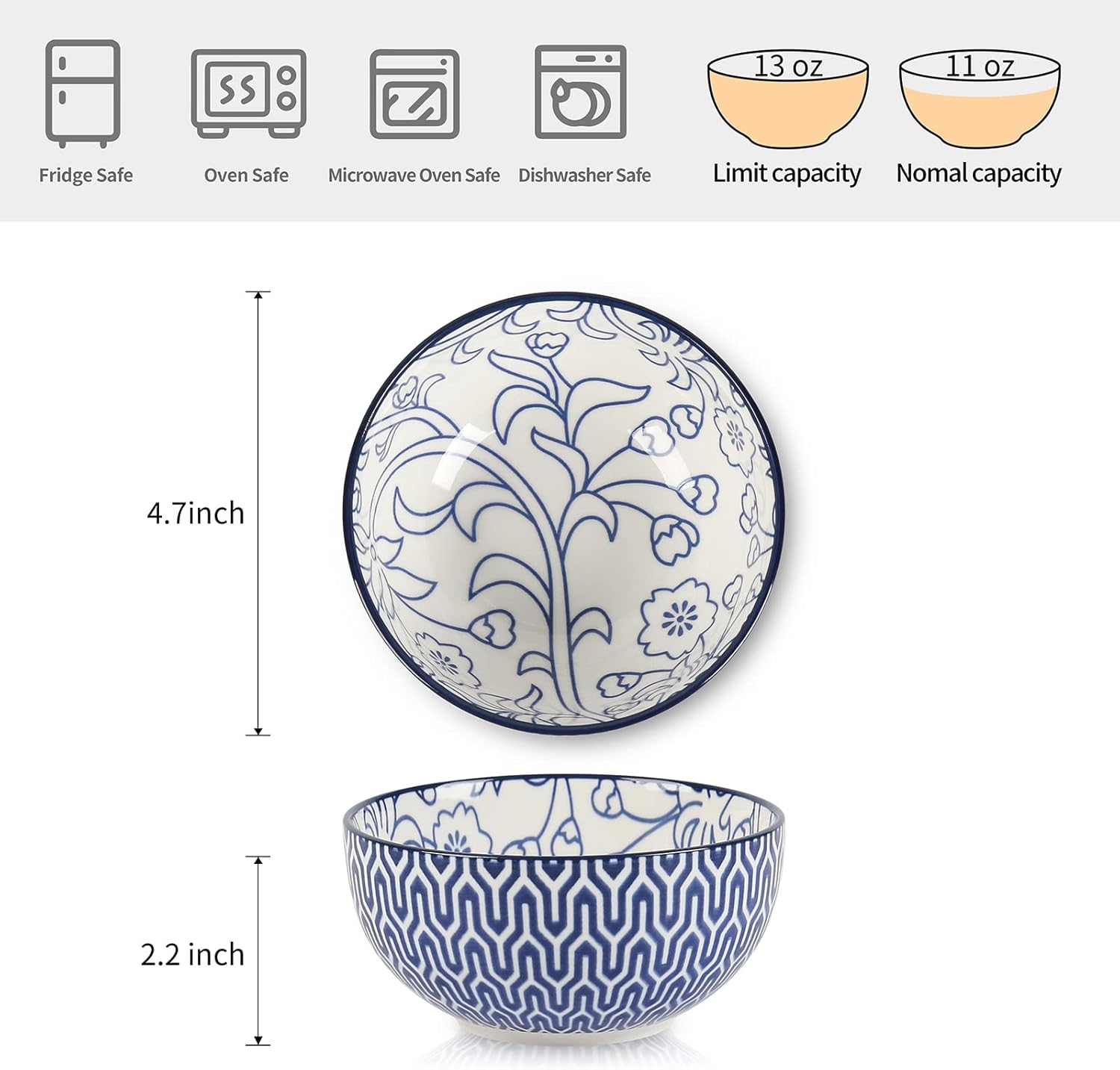 Selamica Ceramic 12 OZ Dessert Bowls Set, Ice Cream Bowls, 4.7 Inch Small Bowls for Snack, Side Dishes, Rice, Microwave Dishwasher Safe, Set of 6, Vintage Blue