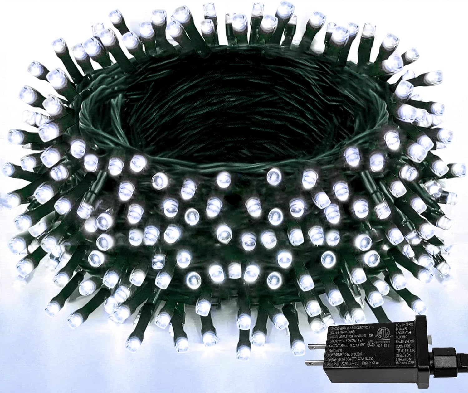 - Upgraded LED String Lights Indoor Outdoor: Super bright with new upgraded LED bulbs. The 300 LED warm white green wire plug in string lights have 8 lighting modes to get decorative effect.. Total length is 108.8ft, of which 99ft with lights.