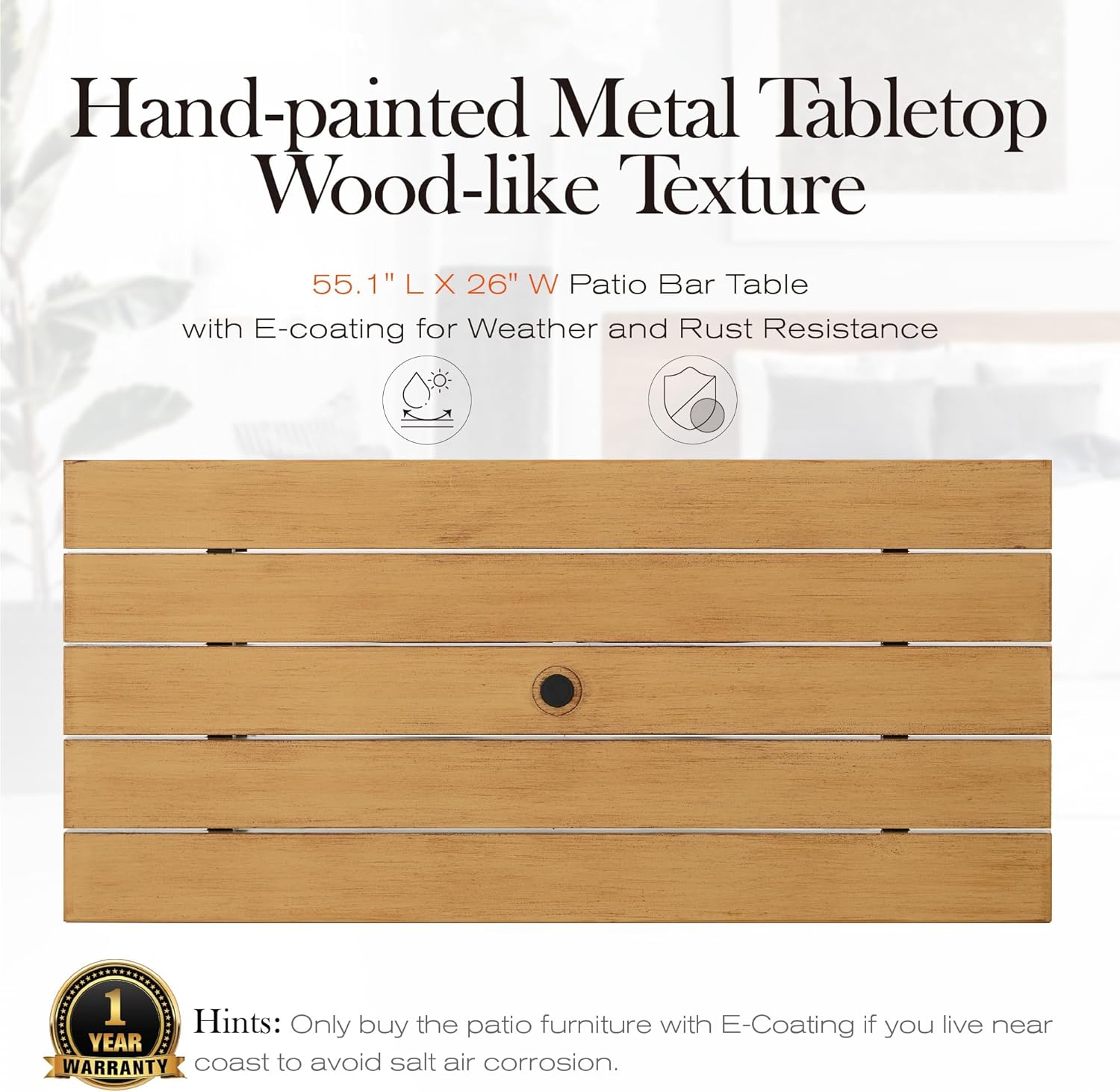 - 【Barheight Patio Table and Chairs】Combines ergonomic high back design with seamless swivel functionality, this bar set provides a stylish and elevated seating option that adds flair to any space. Patio bar table features a handpainted tabletop with woodlike texture. Umbrella hole: 1.57
