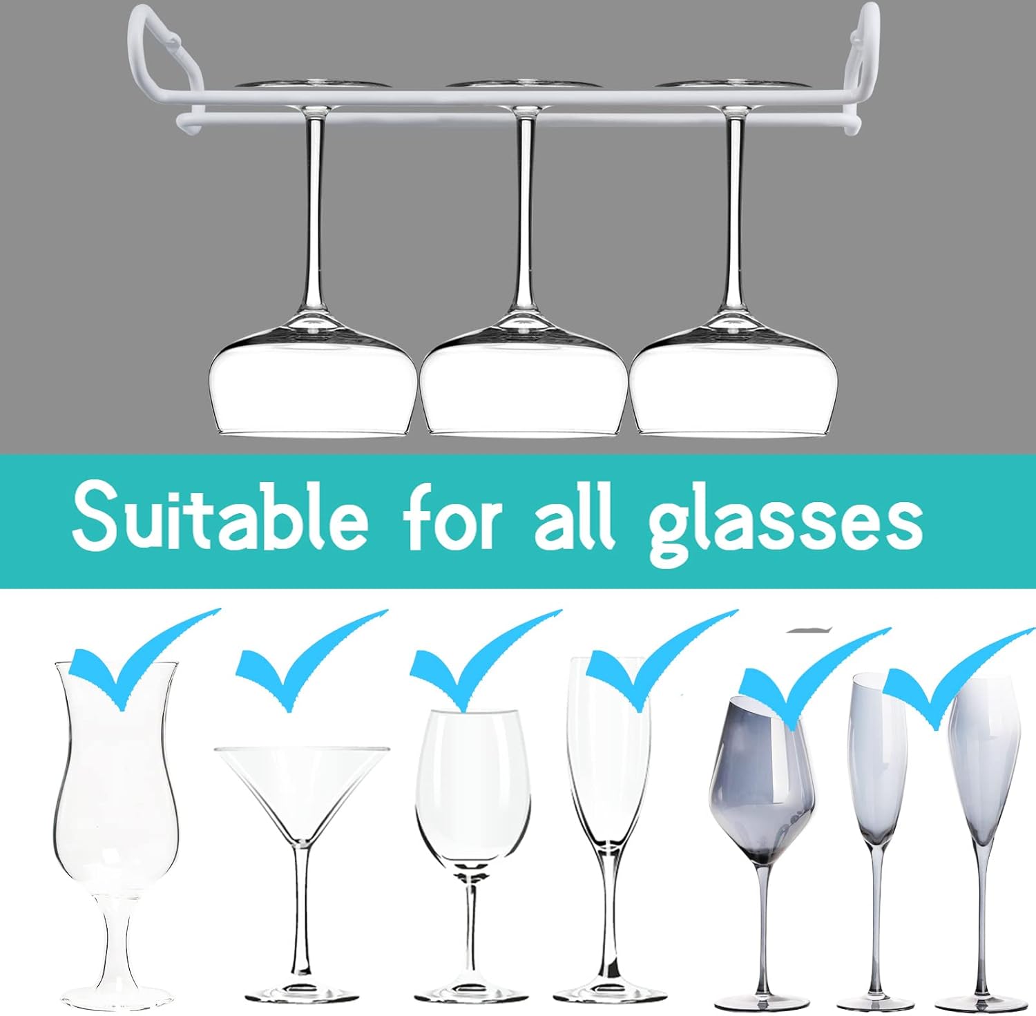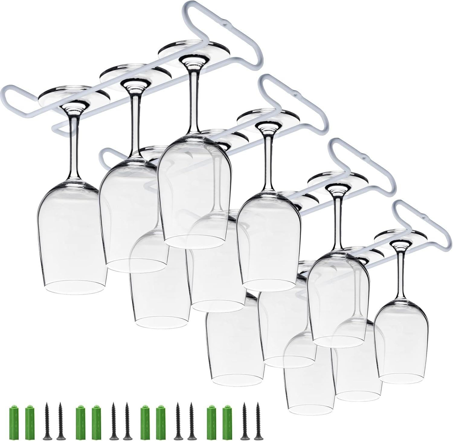 - Easy installation. under cabinet wine glass holder Equipped with screws and anchors. Our sets include screws. Fits under most cabinets.