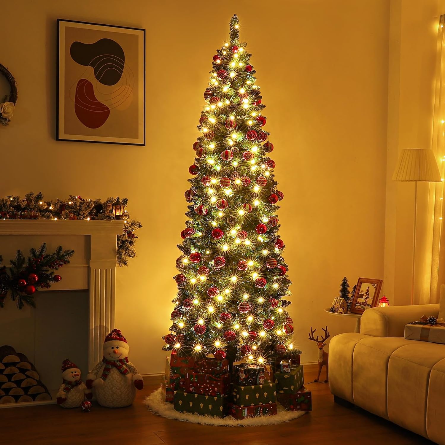 - PRE-DECORATED DESIGN: The pencil Christmas tree comes in a rich uniform color, with natural green leaves, Crafted with 775 branch tips, 210 lights, pine cones, and snow flocked leaves, the 7 ft Christmas tree is leafy and will give you an elegant look. This Flocked Christmas Tree OVERALL DIMENSIONS: 28.7"(Dia) x 82.6"(H)