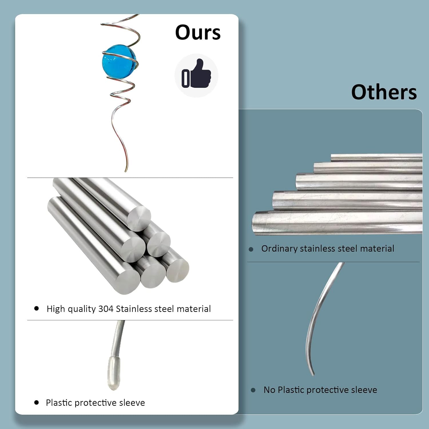 - 【High Quality Gazing Ball Spiral Tail 】This wind spinner spiral tail is made of 304 stainless steel wire,the blue gazing ball made of solid glass ball of solid color glass material,have good weather resistant,no fading under sunshine.Better quality than iron material with nickle plating and painting color glass ball in the market. Unlike others spiral tail,our wind spinner stabilizer is also equipped with a plastic protective sleeve at the tail.