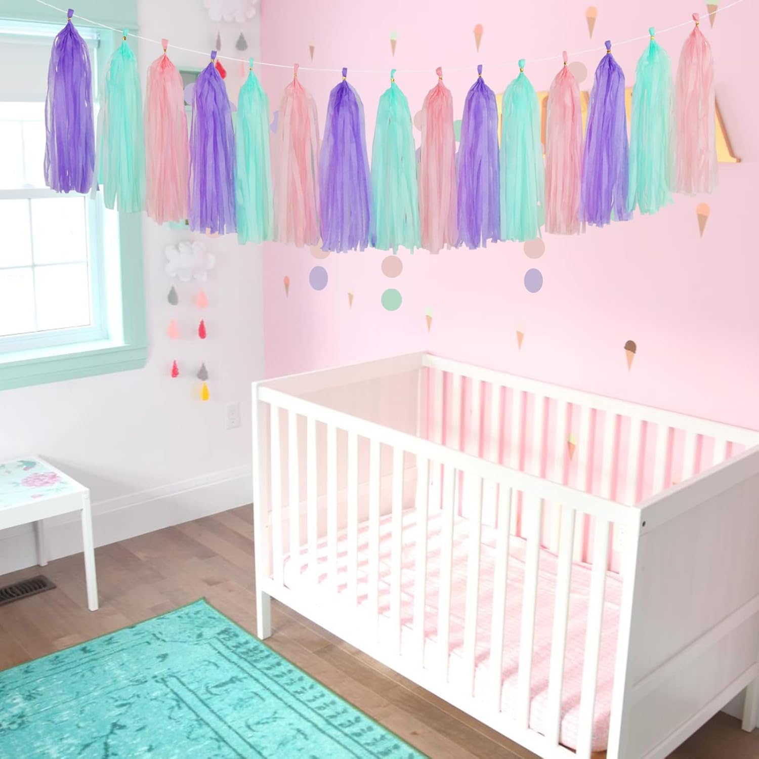 - 【Garland includes】15tassels,5pcs purple tassel garland, 5pcs pink tassel garlands, 5pcs mint garlands. Each tassel is about 14" long after assembled. And each garland comes with a 10ft long free String for hanging these tassels.