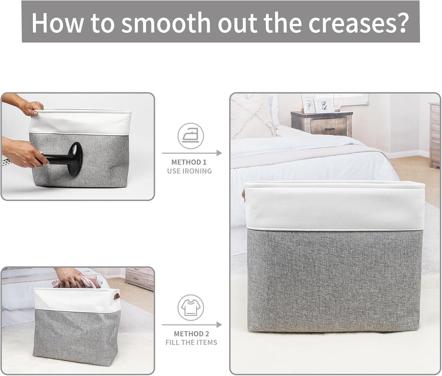 - 【Maintenance & Care Tip】 - Collapsible design for space saving. Our foldable baskets comes in a compression packing which may result in wrinkled storage bin during the long transit. Get rid of the wrinkles by either stuffing the fabric storage bins with blankets and pillows for a few days or steam iron them at low-heat setting. The organization baskets are easy to clean, you can dust the basket with a soft cloth with light soapy water when needed.