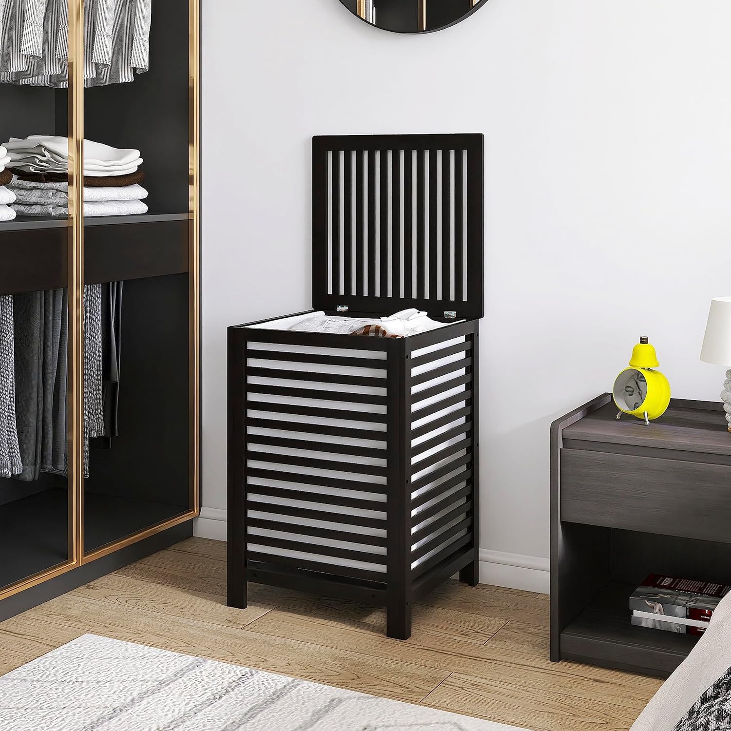 - ★ WITH LID & 2 COMPARTMENTS: The lid of the hamper is an open design for easy opening and throwing clothes in, and the cover protects your privacy and prevents the odor from dirty clothes; The 2 separate canvas-lined compartments are designed to help you place different clothes by color, material or type, avoiding the hassle of dyeing or resorting