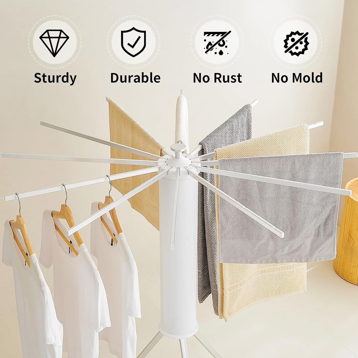 - Sturdy& Durable: Space-saving drying clothes rack has 12 metal rods,The clothes drying rack can hold up to 45 lbs garments; You can expand the number of arms you need according to the space and usage needs.The unique tripod structure of the collapsible drying rack can maintain perfect stability in a limited space