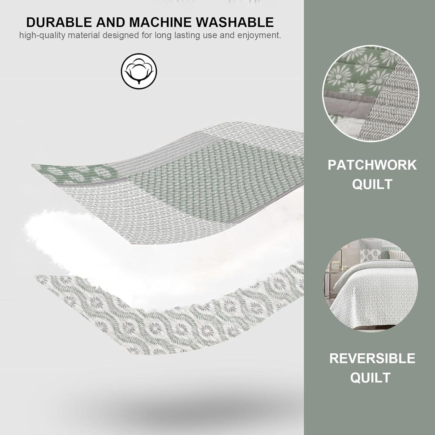 PANGUSHAN Quilt Set Queen Size, 100% Cotton Bedspread Quilt Bedding Set, Patchwork Reversible Floral Quilt for Queen Bed, Greyish-Green Bed Spread, Lightweight Comforter for All Season, 3 Pieces