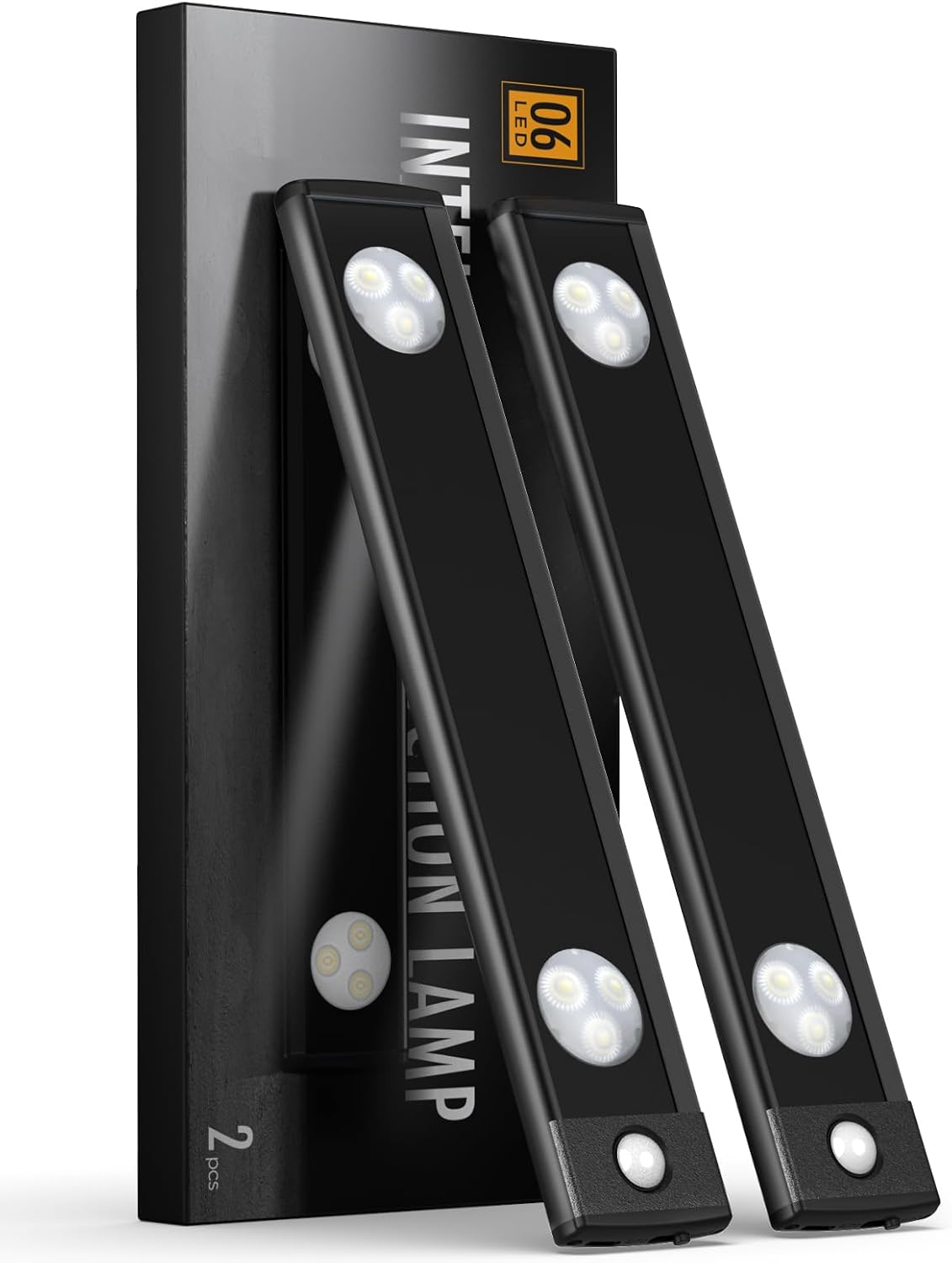 Under Cabinet Lights, Wireless Motion Sensor Light Indoor, Black 10in LED White Lighting Rechargeable Battery Operated,4 Modes Night Light, Stick-On Magnetic Closet Lights for Kitchen, Hallway(2 Pack)