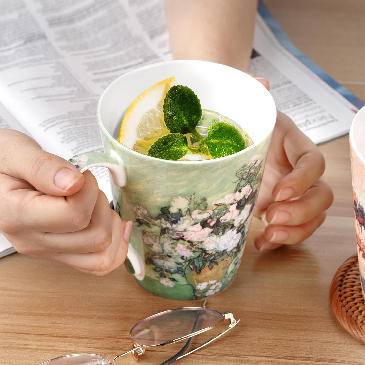Coffee Mug Sets of 4, 12oz Bone China Porcelain Cups with Art Print Large Handle Dishwasher Microwave safe for Tea Cocoa or Hot Chocolate