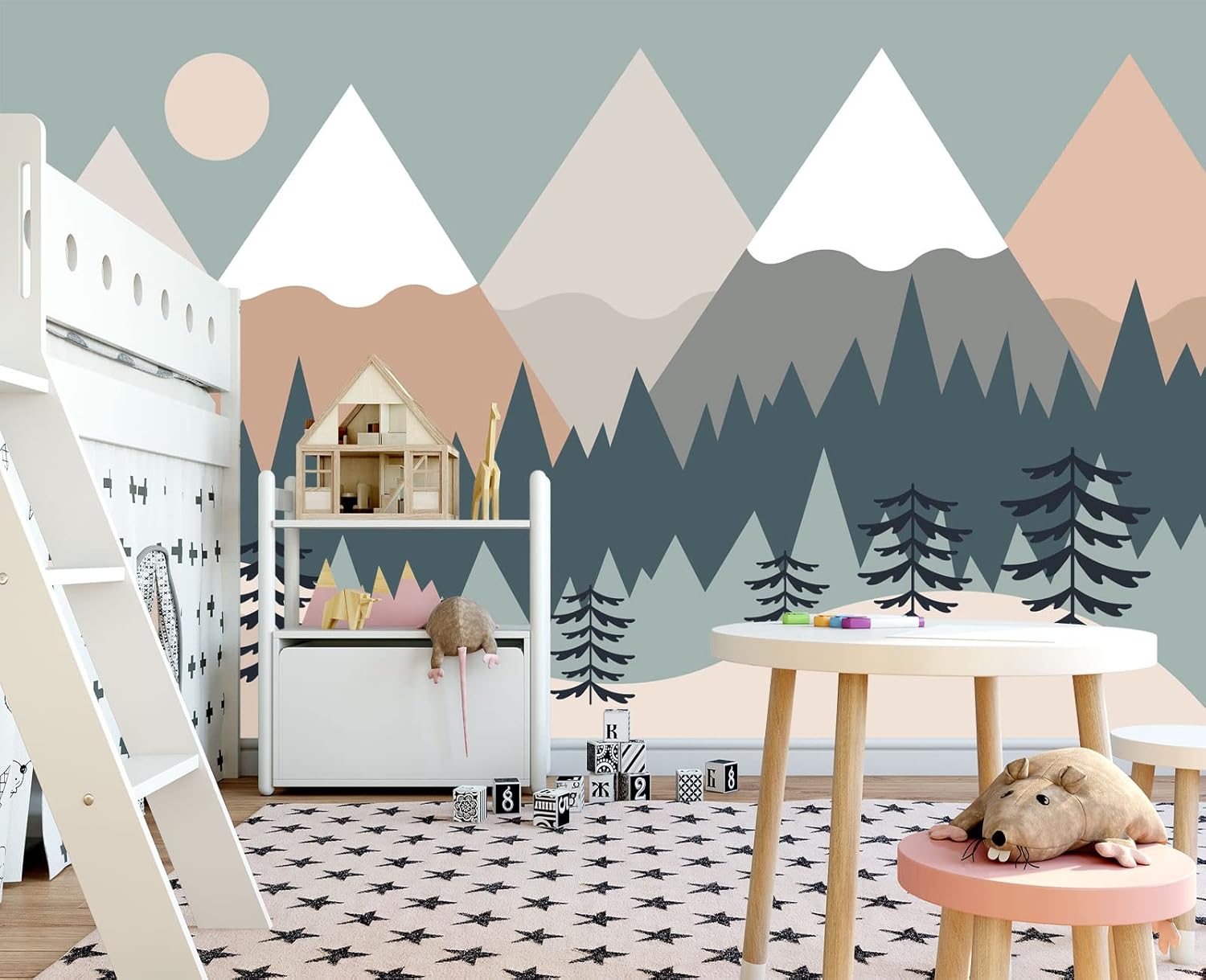 Children's Cartoon Mountain Peak Forest Sun Nursery Wall Mural Wallpaper 178" x 117"
