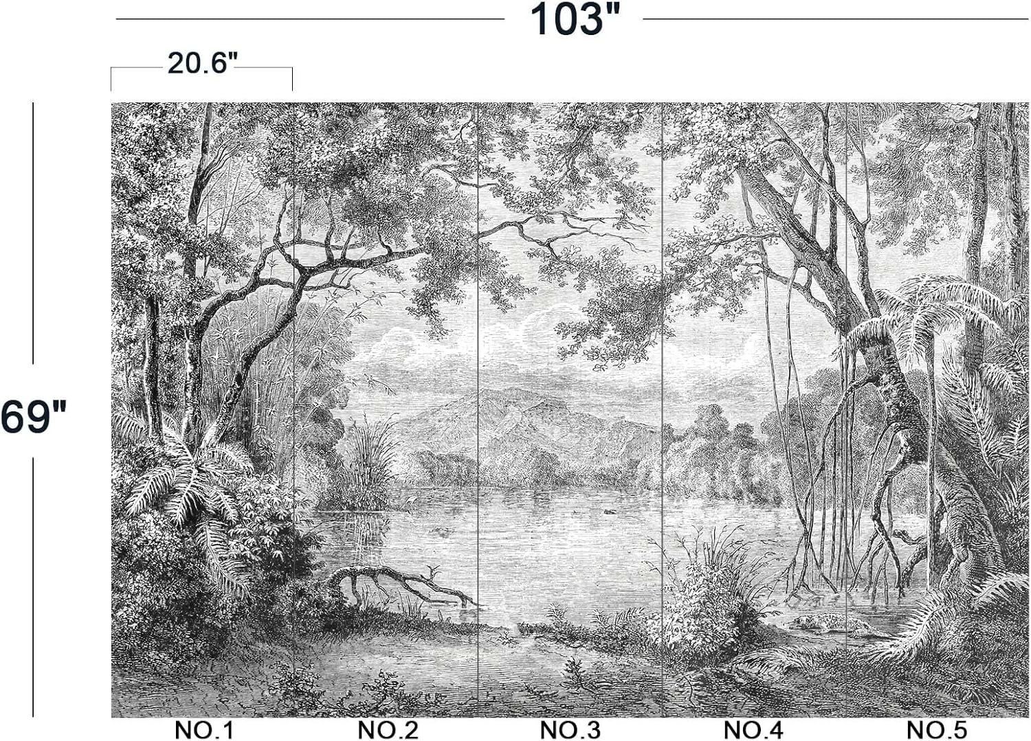 - The size of the wallpaper is 103" wide x 69" high and divided into 5 panels.