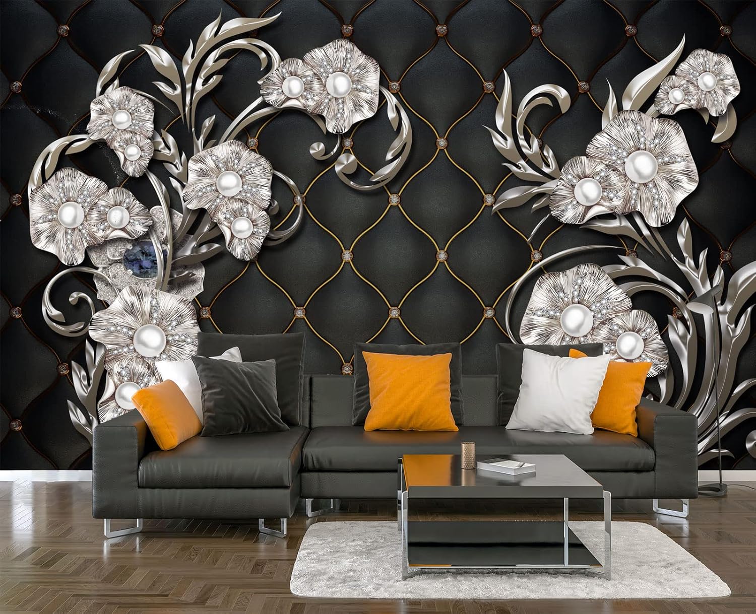 Black Hard Wrapped Pearl Embossed Flowers Wall Mural Wallpaper for Bedroom 137" x 100"