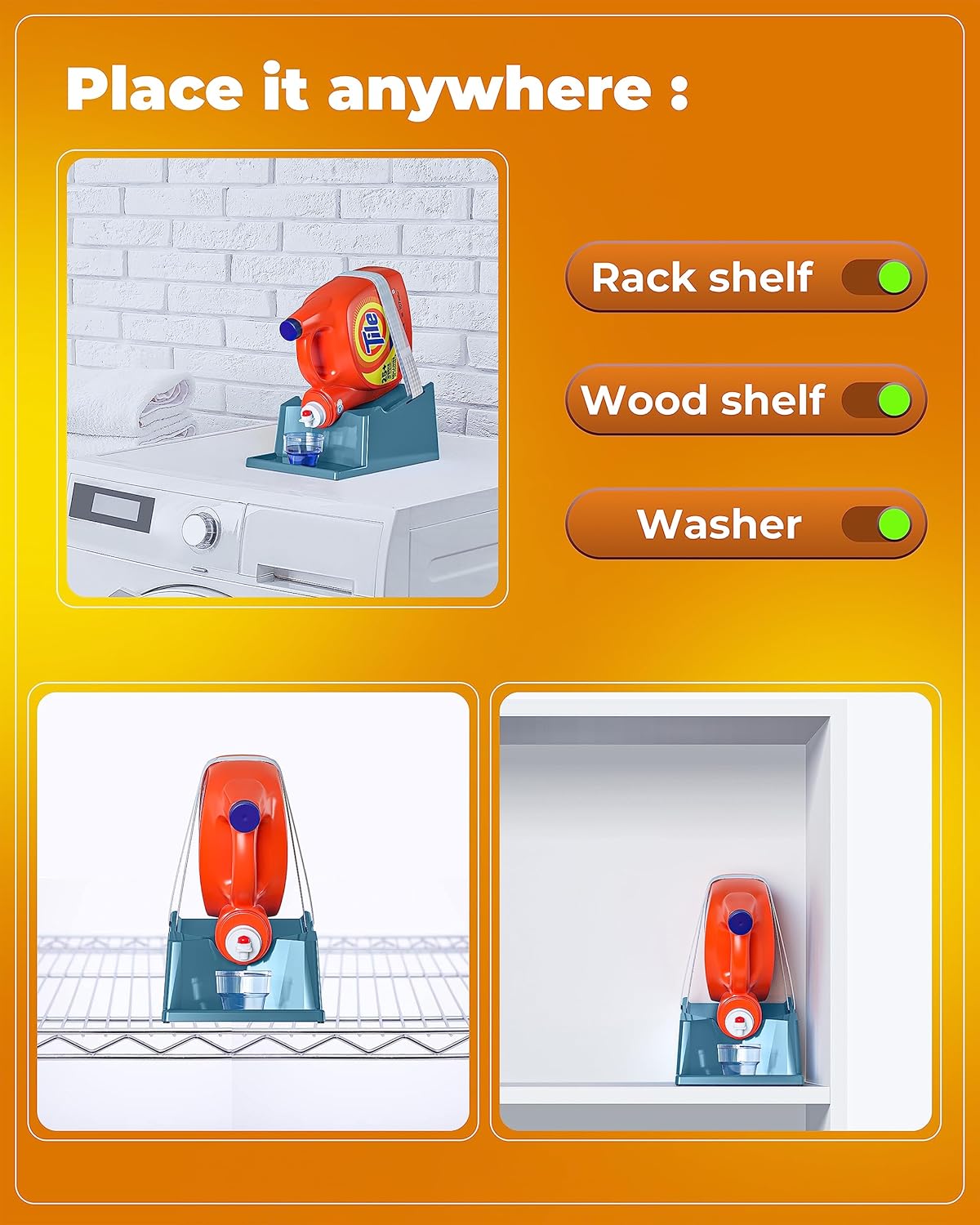 - [Safe Attachment:] The laundry detergent shelf or holder features a secure strap that firmly attaches and ensures your detergent bottle stays in place and minimizing the risk of accidental falls and spills.