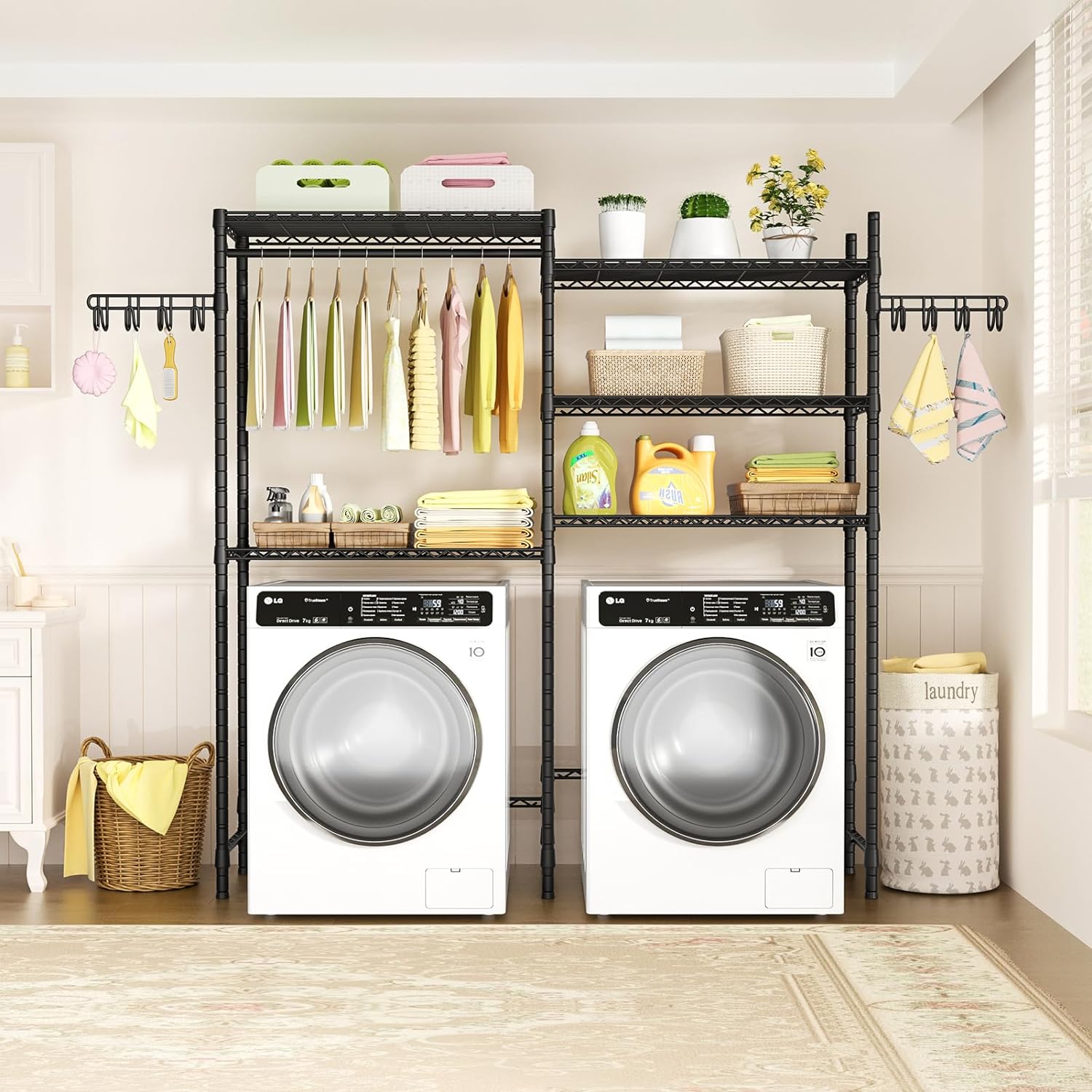 - Space Saver: The over-the-washer and dryer storage rack can place a washing machine and a dryer. The 5 wire shelves can help store and organize laundry belonging. They can hold most of the laundry room items, like wash powder and wash liquid. Also, the hanger rod and hooks can hang some clothes or towels