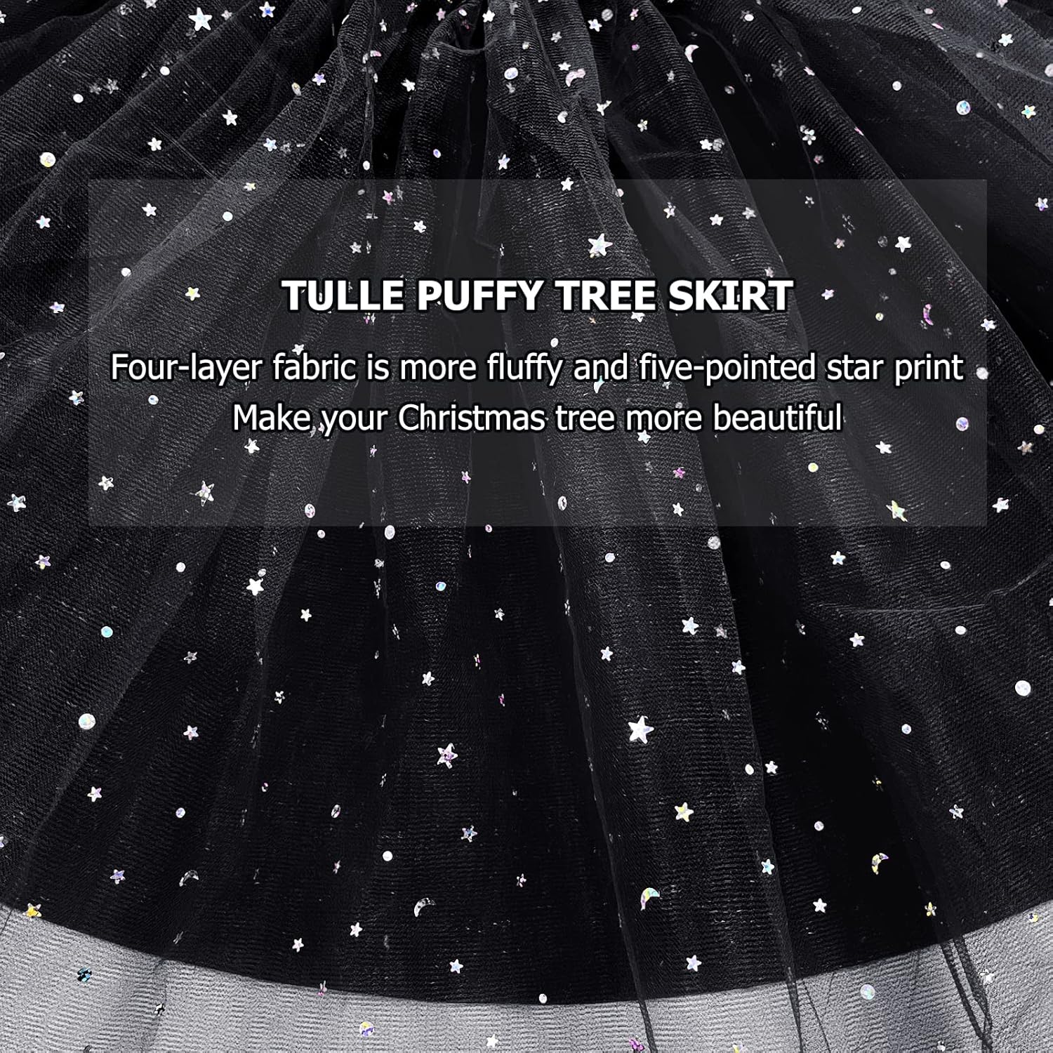 - 4 Layer Thickening Design:The 4-layer pleated skirt style design is very fluffy and very beautiful;The mesh gauze adopts the latest technology, the sequins on it are stronger and won't fall off easily;light shines the Christmas tree skirt will sparkle
