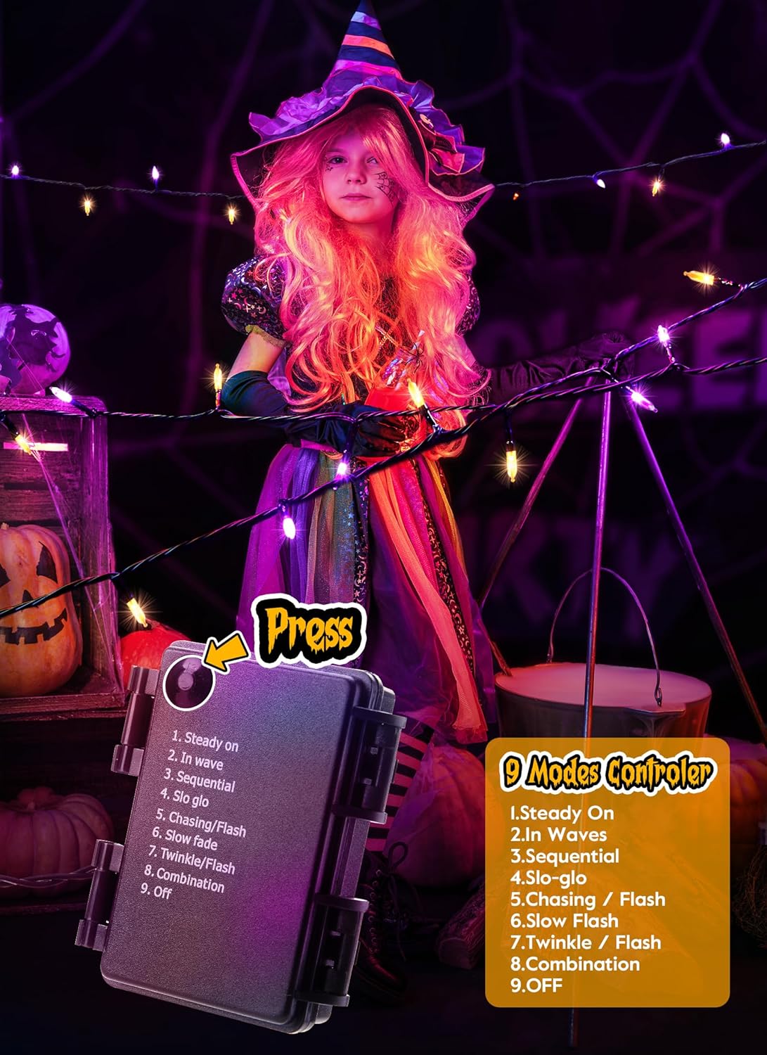 - 【8 Preset Modes】Fantastic lighting effects of these Halloween lights, adapting to desired occasions or events: press the button on the control box repeatedly to select 1. steady on, 2. in wave, 3. sequential, 4. slow-glow, 5. chasing/flash, 6. slow fade, 7. twinkle/flash or 8. combination