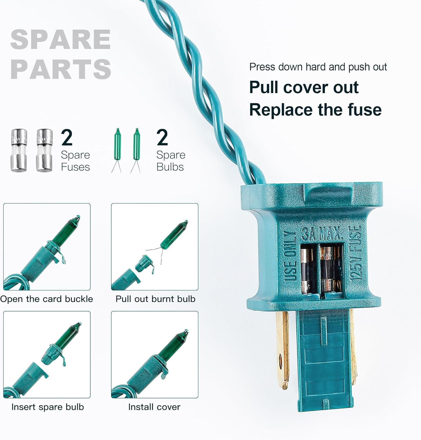 - 🌲Unique Design Christmas Lights: The bulb has a snap-on design and is very easy to replace. When one of our bulbs breaks, it doesn't affect the other bulbs. This is a very special design. You can replace damaged bulbs individually with the spare bulb or fuse provided by us.