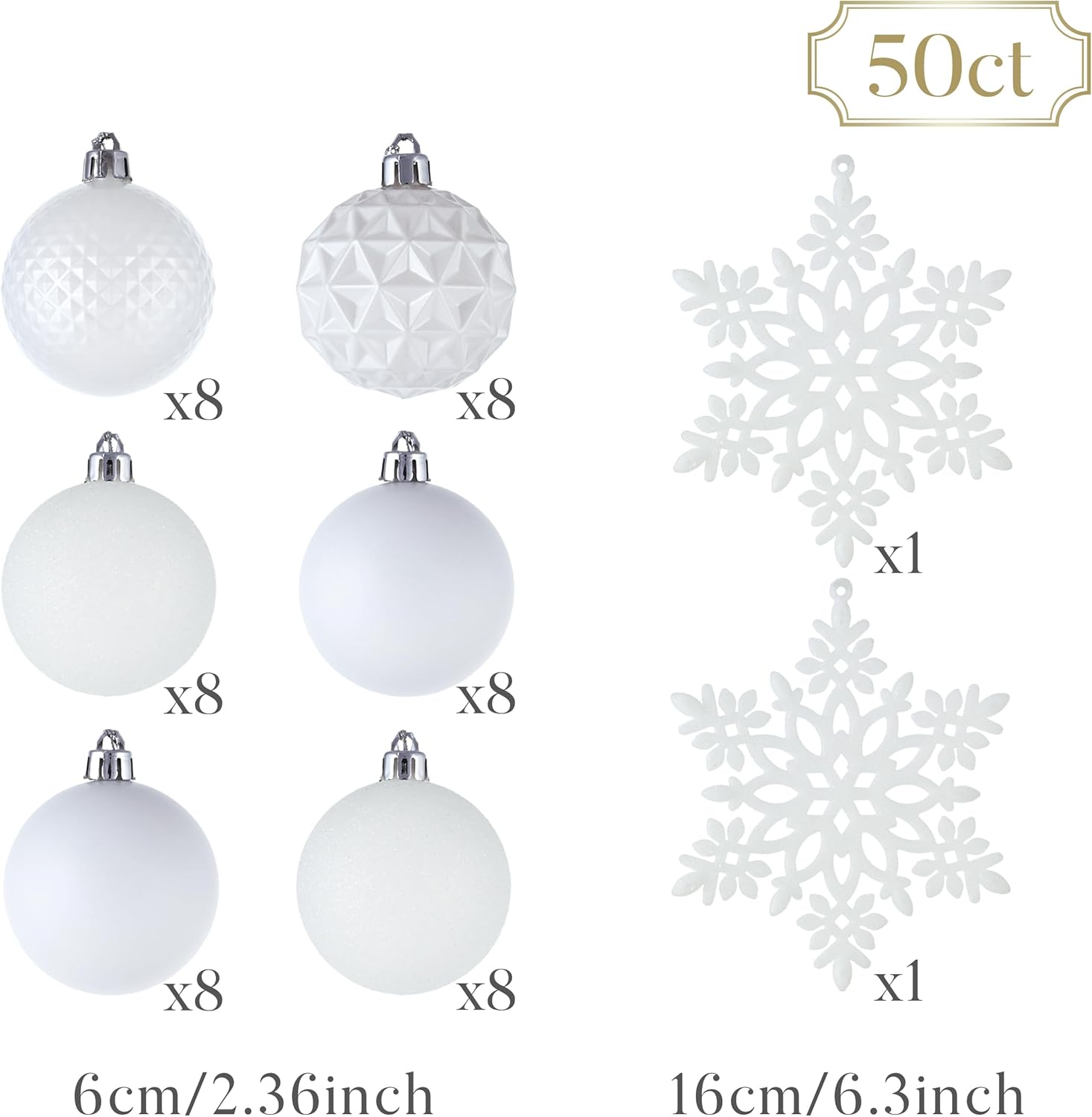 - 【Package and Size】This ornament ball set include 50pcs Christmas ornaments measuring 2.36 inches in diameter, featuring seamless connections for a polished look