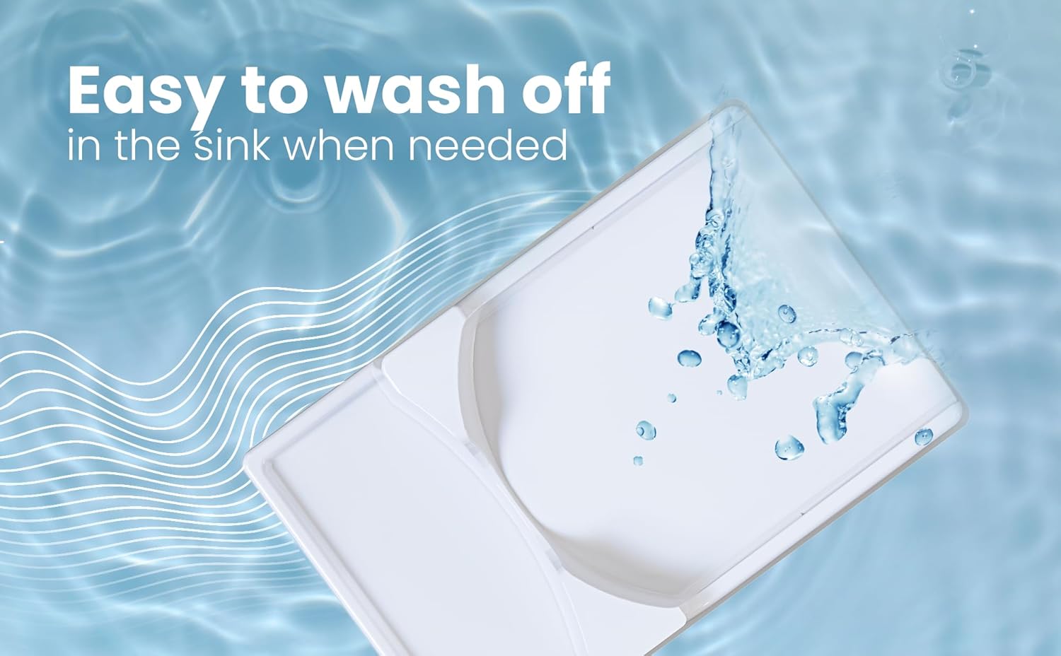 - [MATERIAL] - This Angled Laundry Detergent Holder is made of Plastic with a molded edge to keep the measuring cup from sliding or falling off the platform to prevent the soap or detergent from dripping onto the shelves or floor. There's also a "Rubber" in his feet to secure the soap station firmly in its place