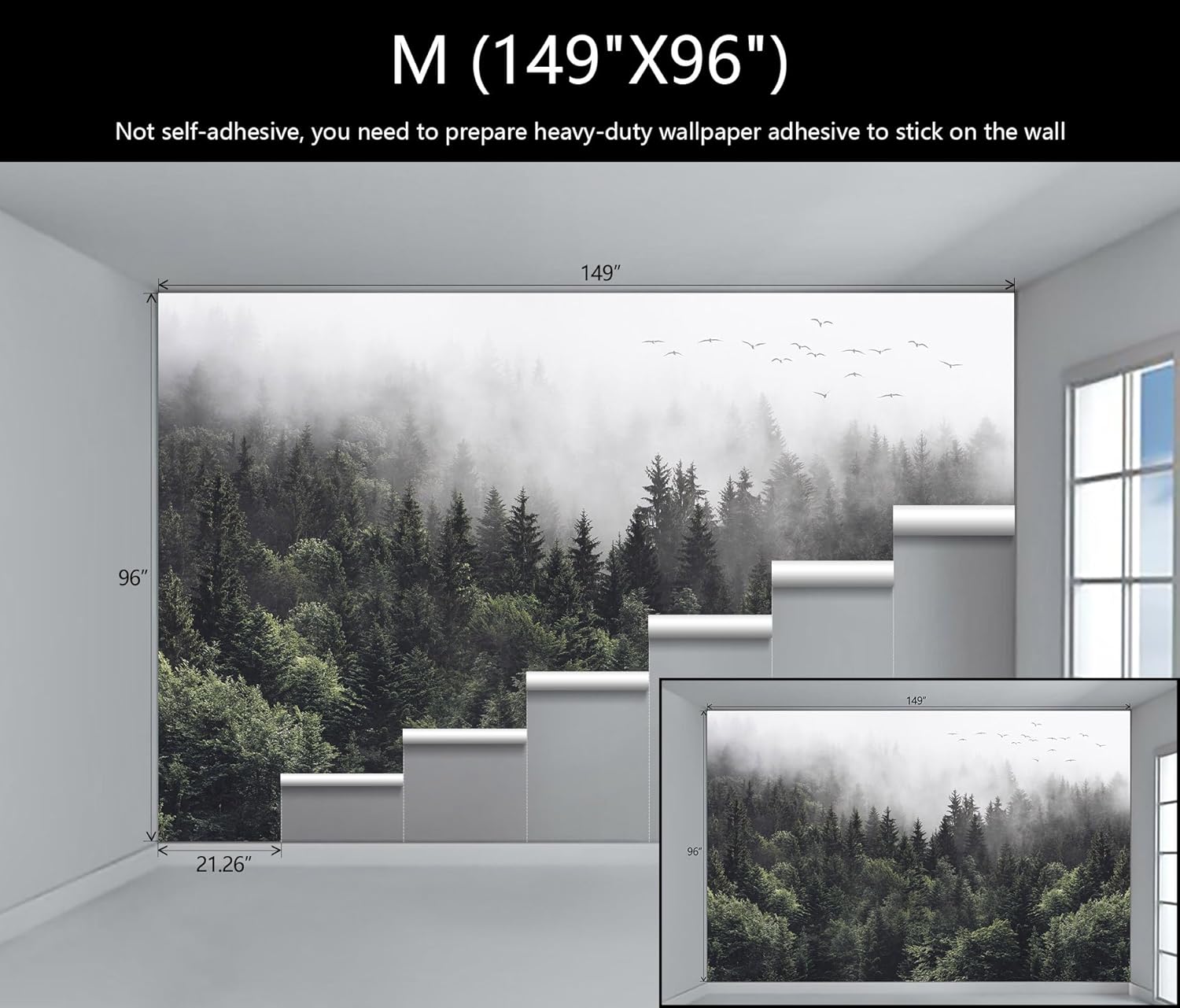 - Mural Size: The total size of this mural wallpaper is 149" x 96" / 378CM x 244CM (W x H), cut into 7 pieces, each measuring 21.26" x 96", for easy installation.