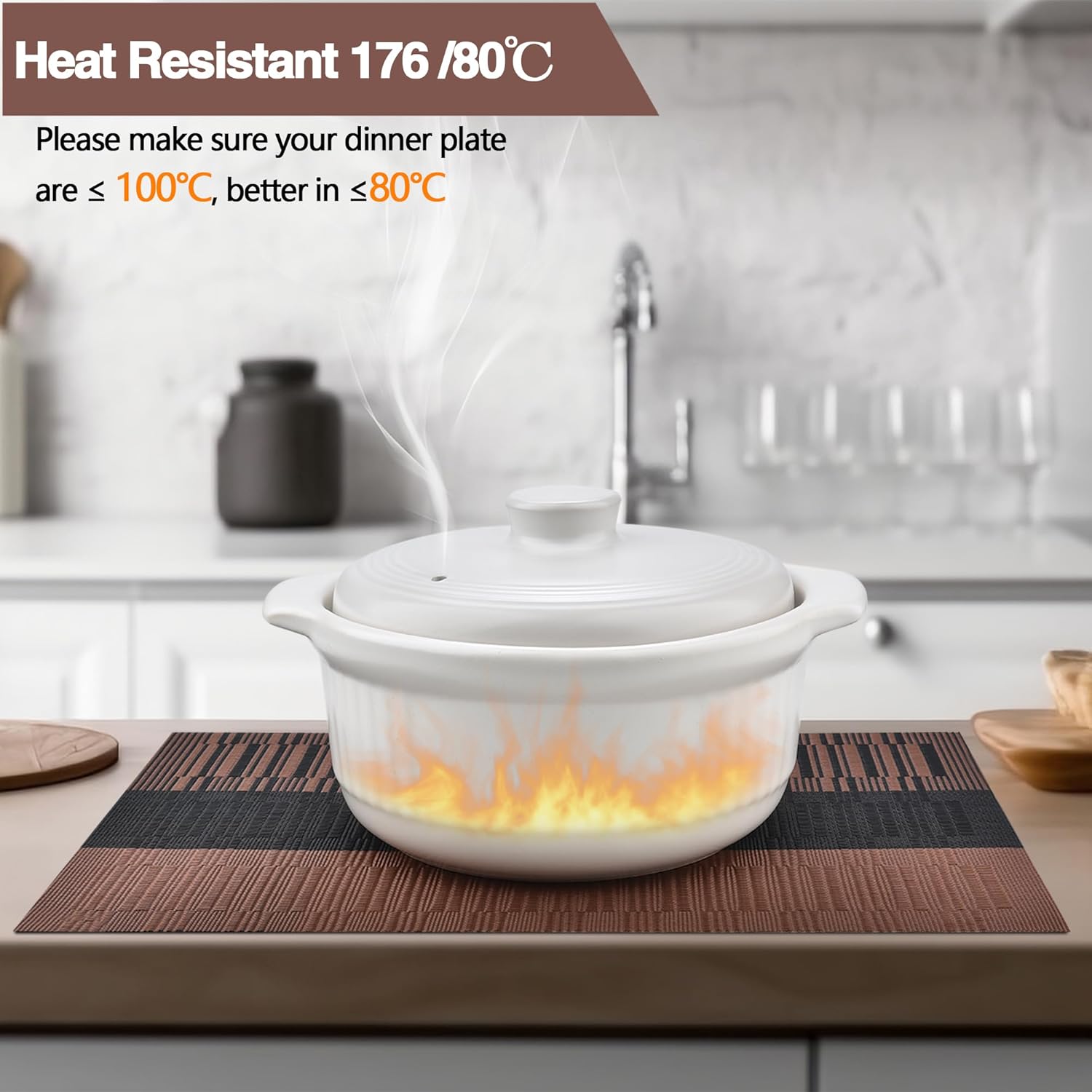 - Heat Resistant: Please make sure your dinner plate are ≤ 100℃, better in ≤80℃. It can prevent the table from slipping and scalding the countertop. These beautiful stylish vinyl place mats to add more fun to your dining table