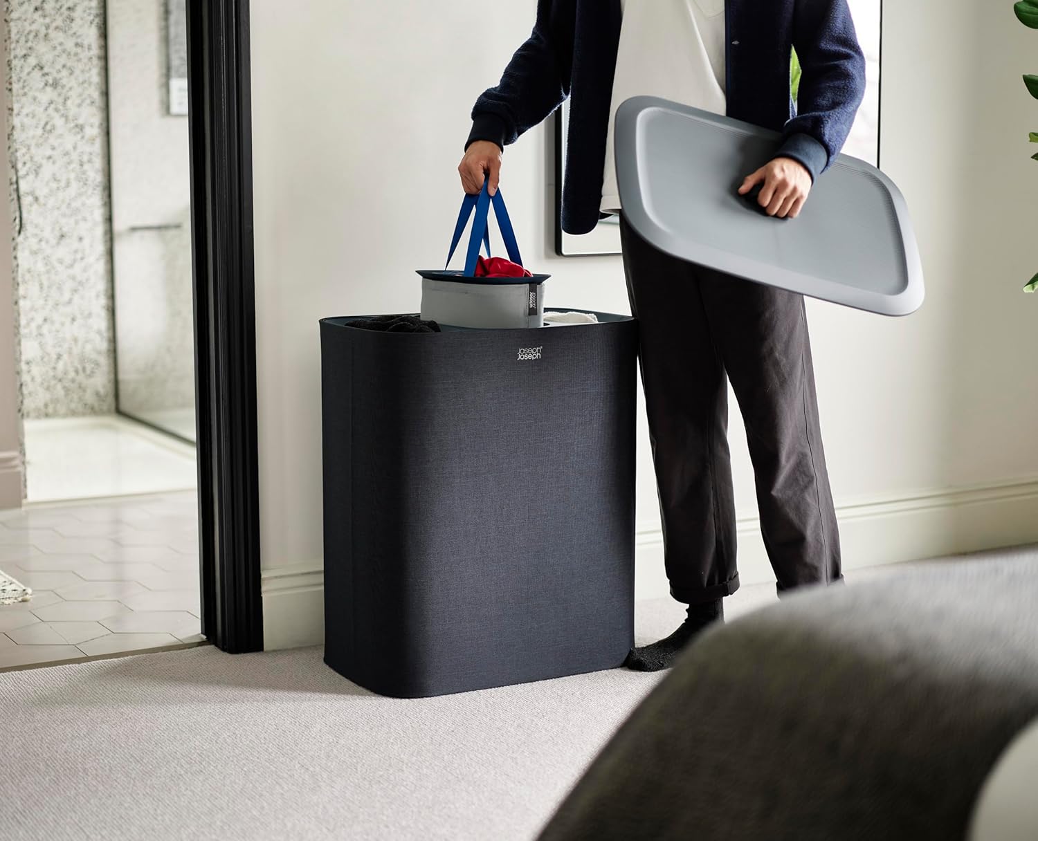 Joseph Joseph Tota Trio 90 liter/23.8 gallon Laundry Hamper Separation Basket with lid, 3 Removable Washing Bags with Handles- Black