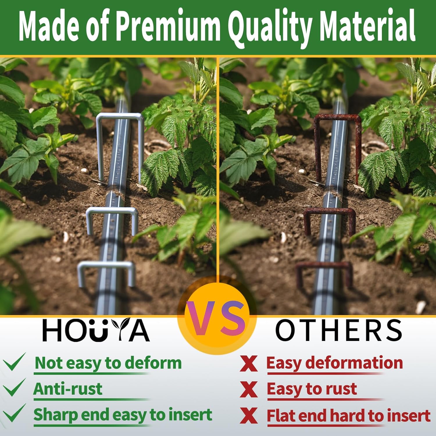 - 【Beveled Ends】The beveled end of the garden staples can easily penetrates turf, landscape fabric, heavy soil and weed barrier.