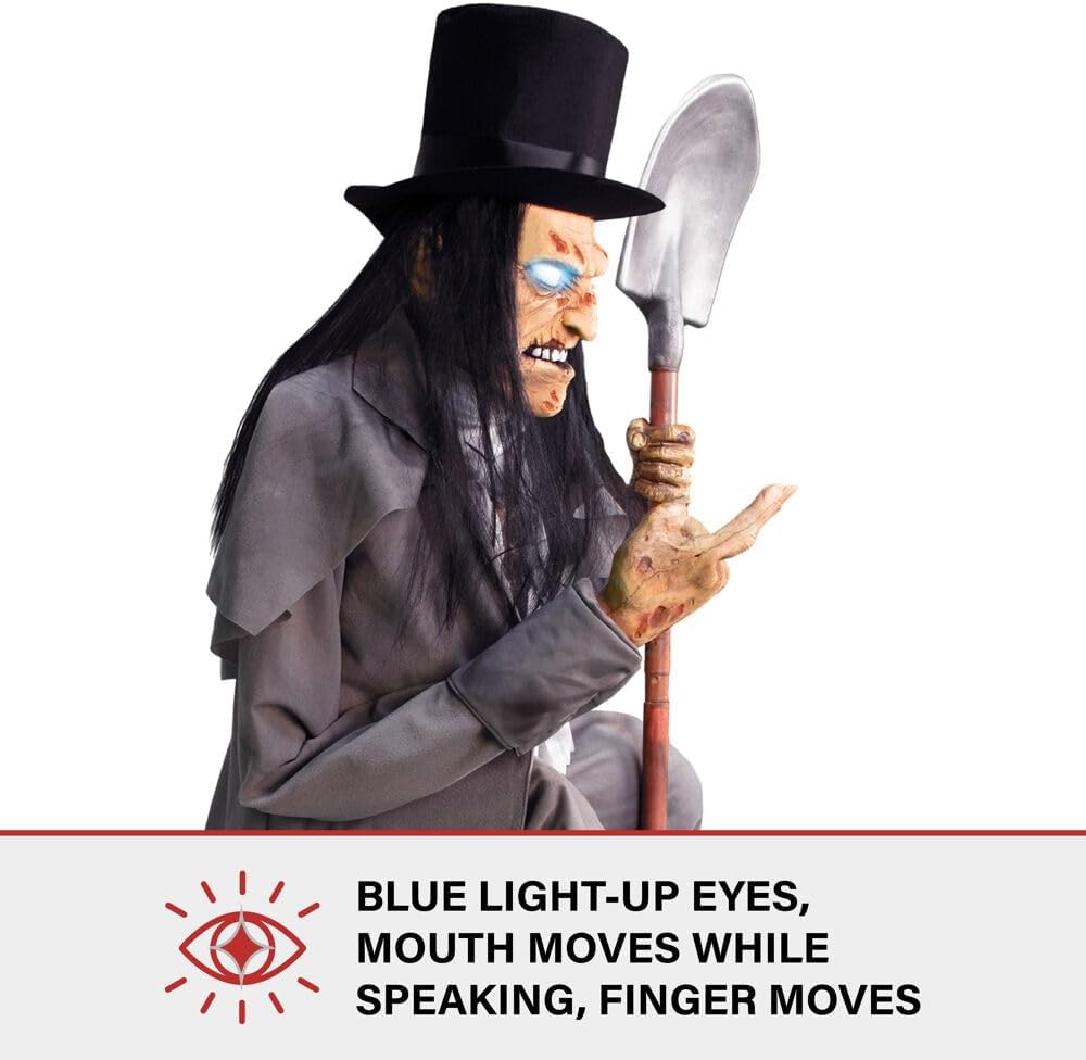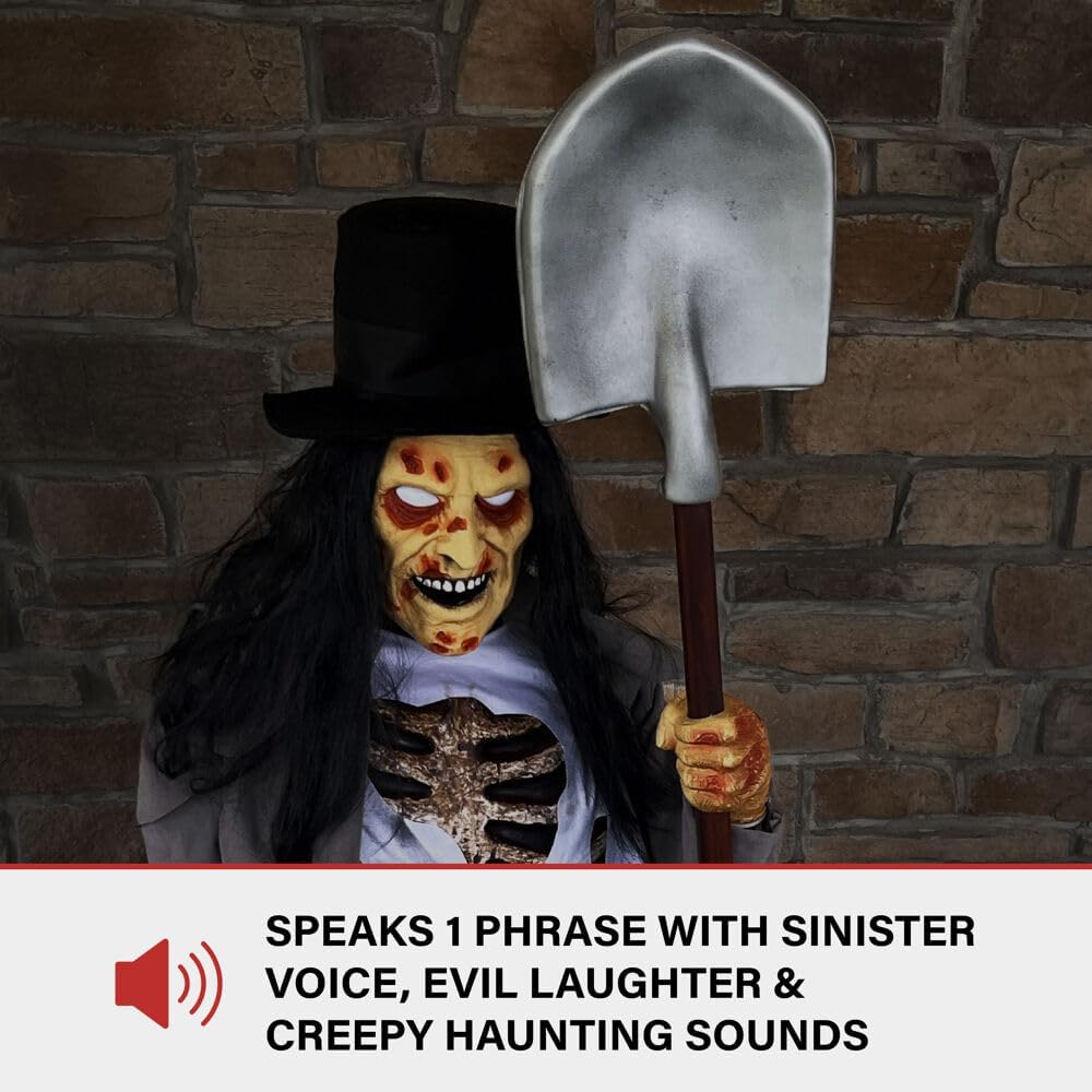 Haunted Hill Farm Motion-Activated Crouching Grave Digger by Tekky, Talking Halloween Animatronic for Indoor or Covered Outdoor Creepy Halloween Decorations, Plug-in or Battery Operated Fright Props