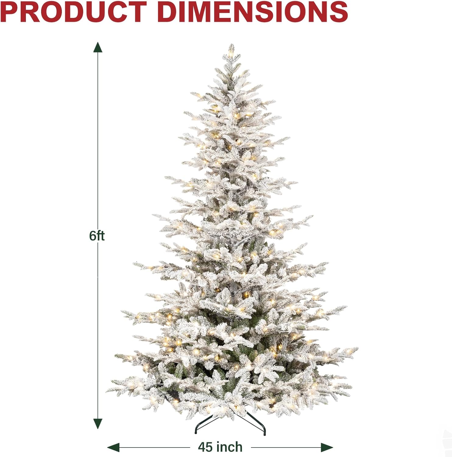- STURDY CONSTRUCTION: Standing at a height of 7.5 feet with a 59 inch diameter at the base, this snow Christmas tree features all-metal construction and comes with a foldable metal tree stand. It strikes the perfect balance between grandeur and versatility.
