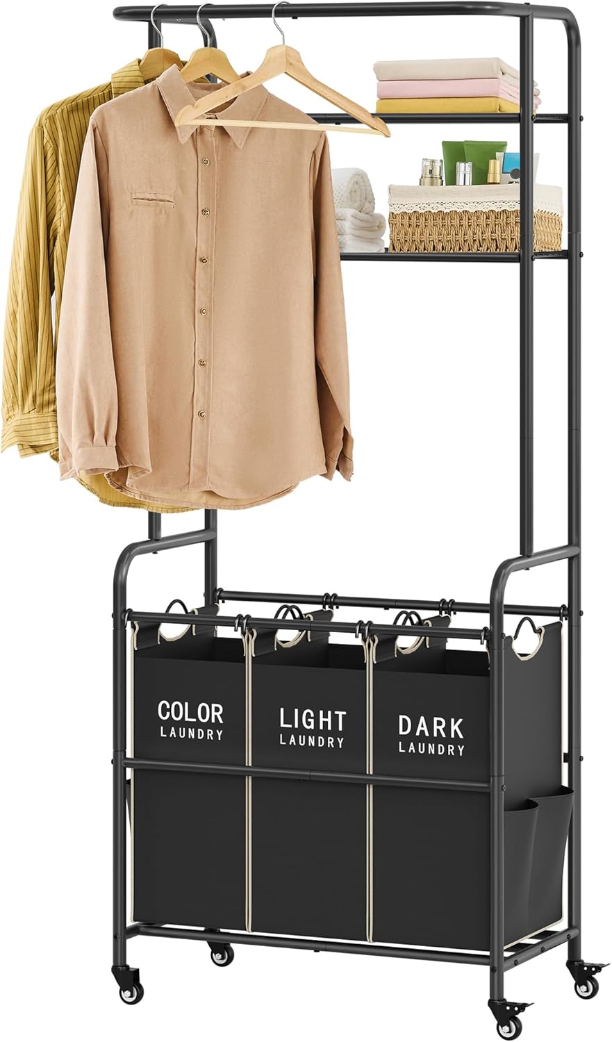 - All-in-One Laundry Sorter: Measuring 29.13"L x 16.14"W x 70.86"H, the laundry hamper with shelf features 3 laundry bags for easy sorting, shelves to store essentials, and a sturdy hanging bar for drying or hanging clothes