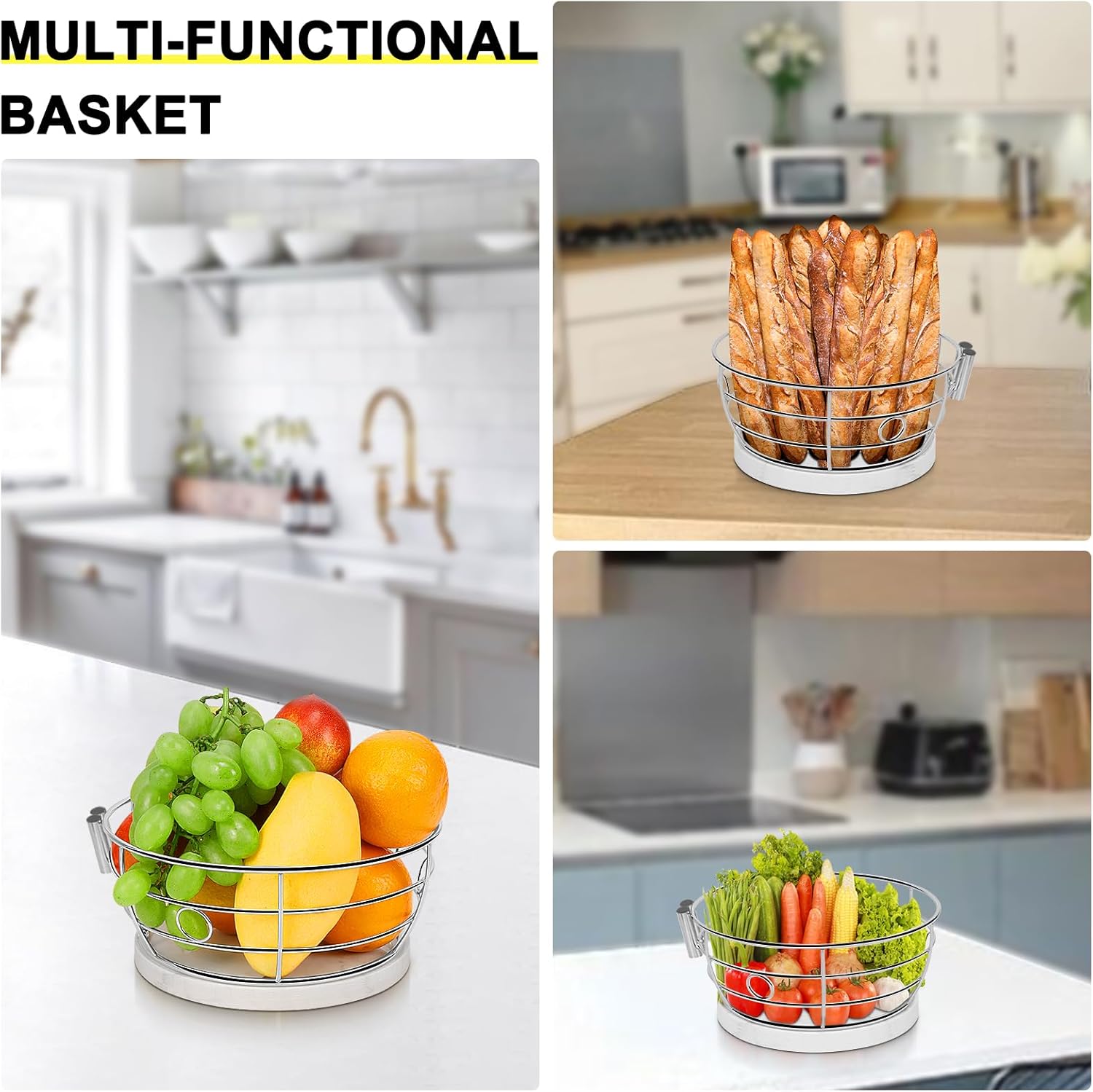- PERFECT FRUITS STORING: The extra fruit basket bowl is ideal for your apples, pears, grapes, oranges,kiwis, snacks, bread and vegetables. Saving your countertop space and keeping your fruits fresh in your table kitchen.