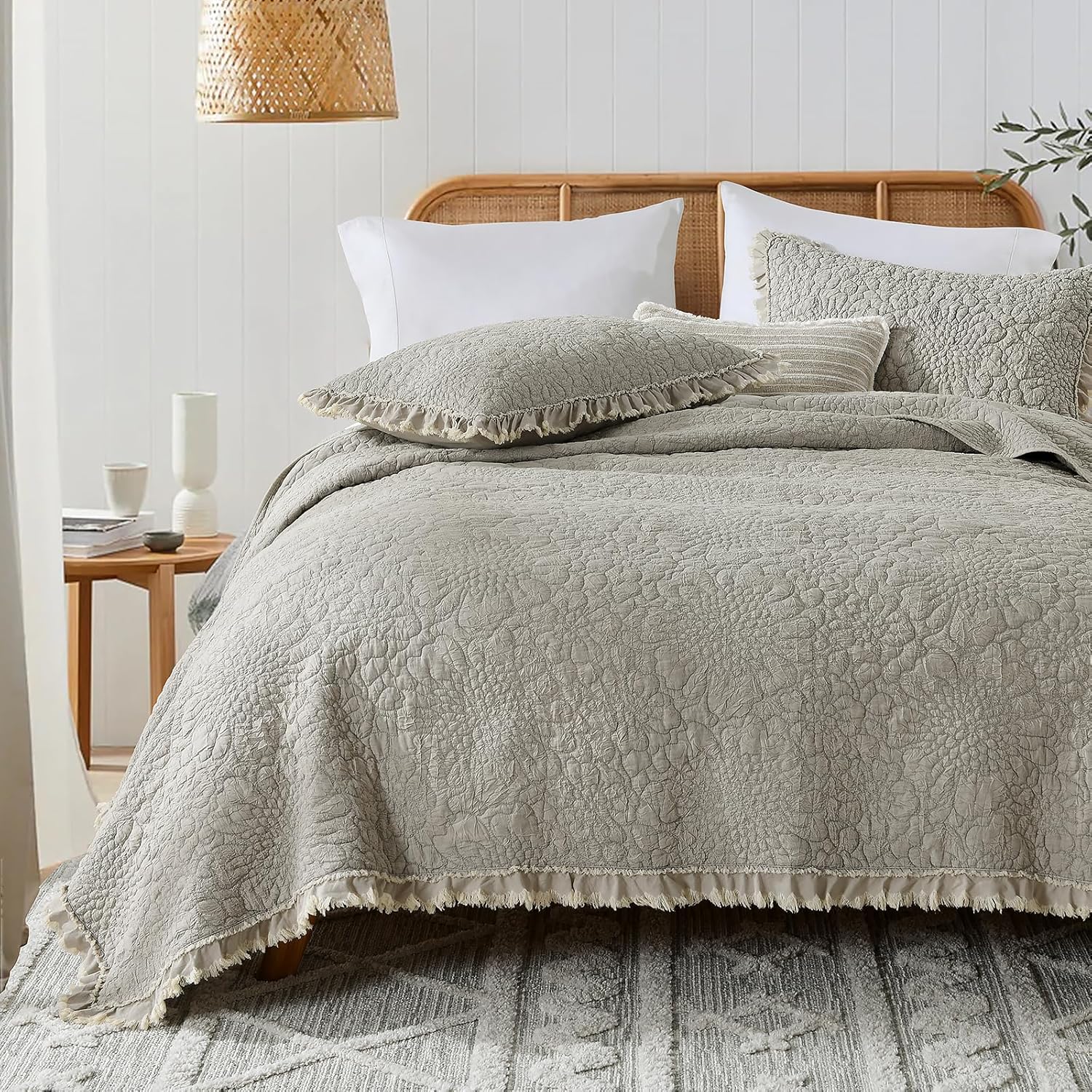 - Elegance Flower Design with Ruffled Edges: This floral stitching reversible quilt, flower quilted pattern on front and back. Added Ruffled Fringe both on bedding set and shams, makes your room stylish and fashion look.