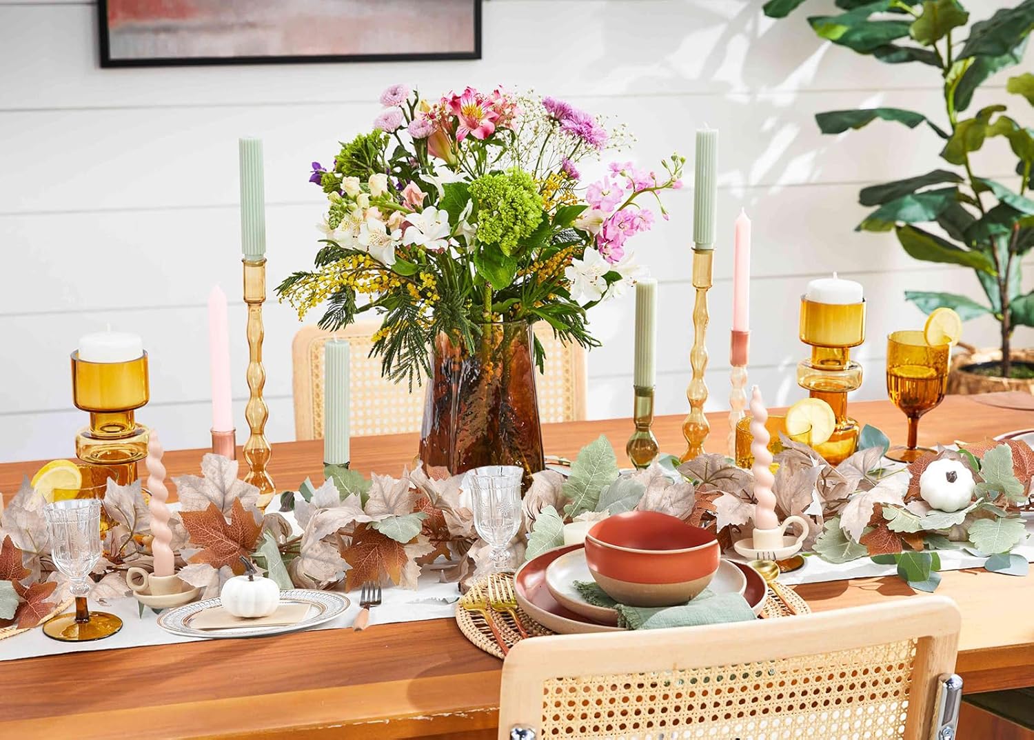 - 【Realistic Fall Leaves Garland】The 7 colors of the maple leaves range from dark green to vibrant orange, look like the real fallen leaves, making for a great blend of colors to warm up any room. Perfect festival decorations for indoor or outdoor.
