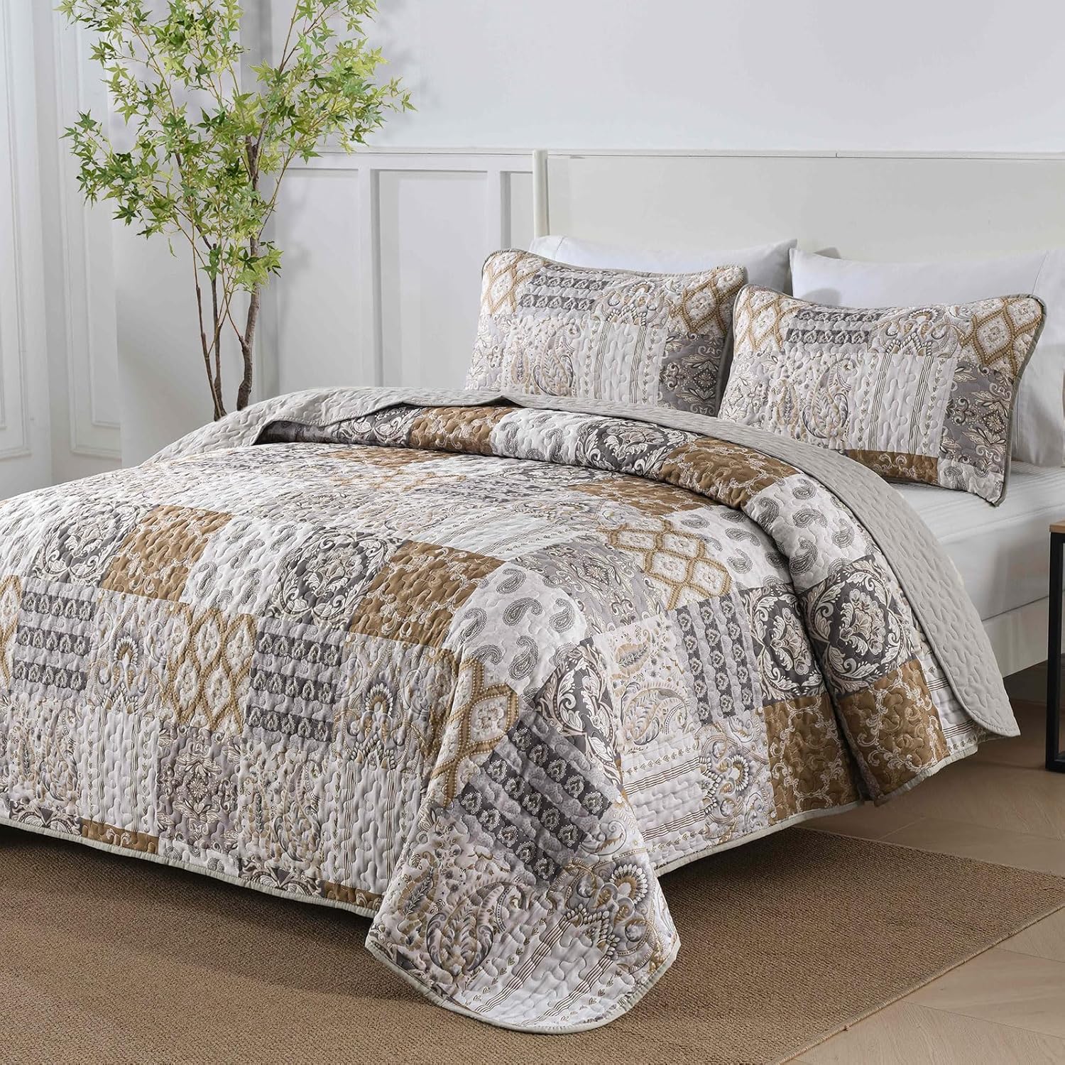 - PATCHWORK BOHO QUILT SET: The bedspread king size bedding set featuring a patchwork plaid design. Combined with bohemian stripe damask and paisley pattern gives this bedspread coverlet a elegant atmosphere.