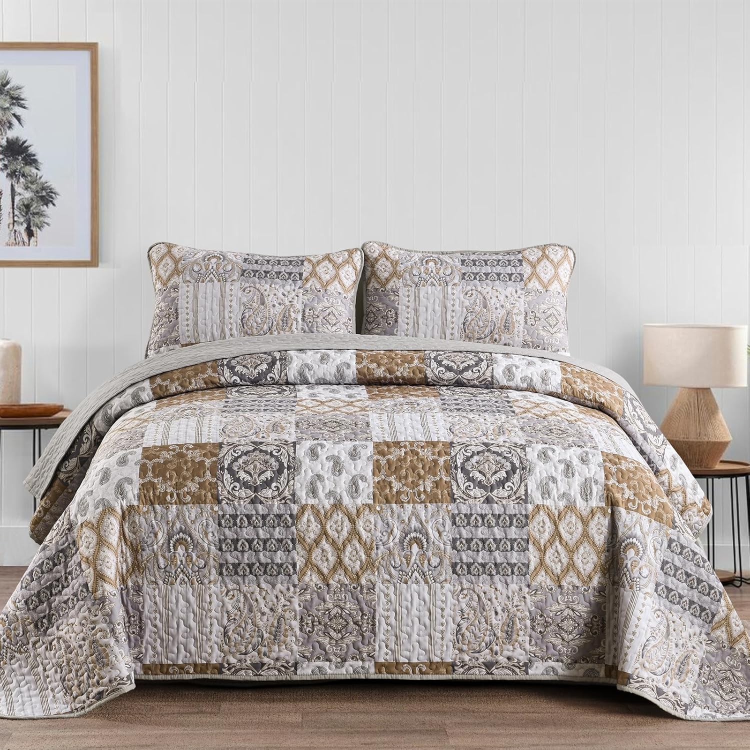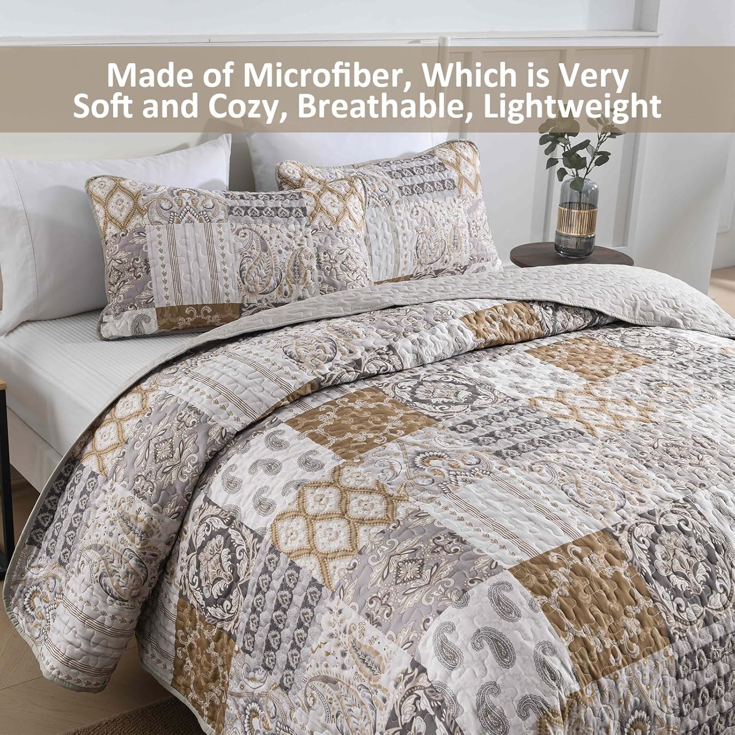 - SOFT MICROFIBER BEDDING SET: The cozy brown patchwork quilt queen size bedding is made from high-quality microfiber, our quilt sets queen is soft to touch, lightweight, and breathable. The firm stitch ensures long-lasting durability.