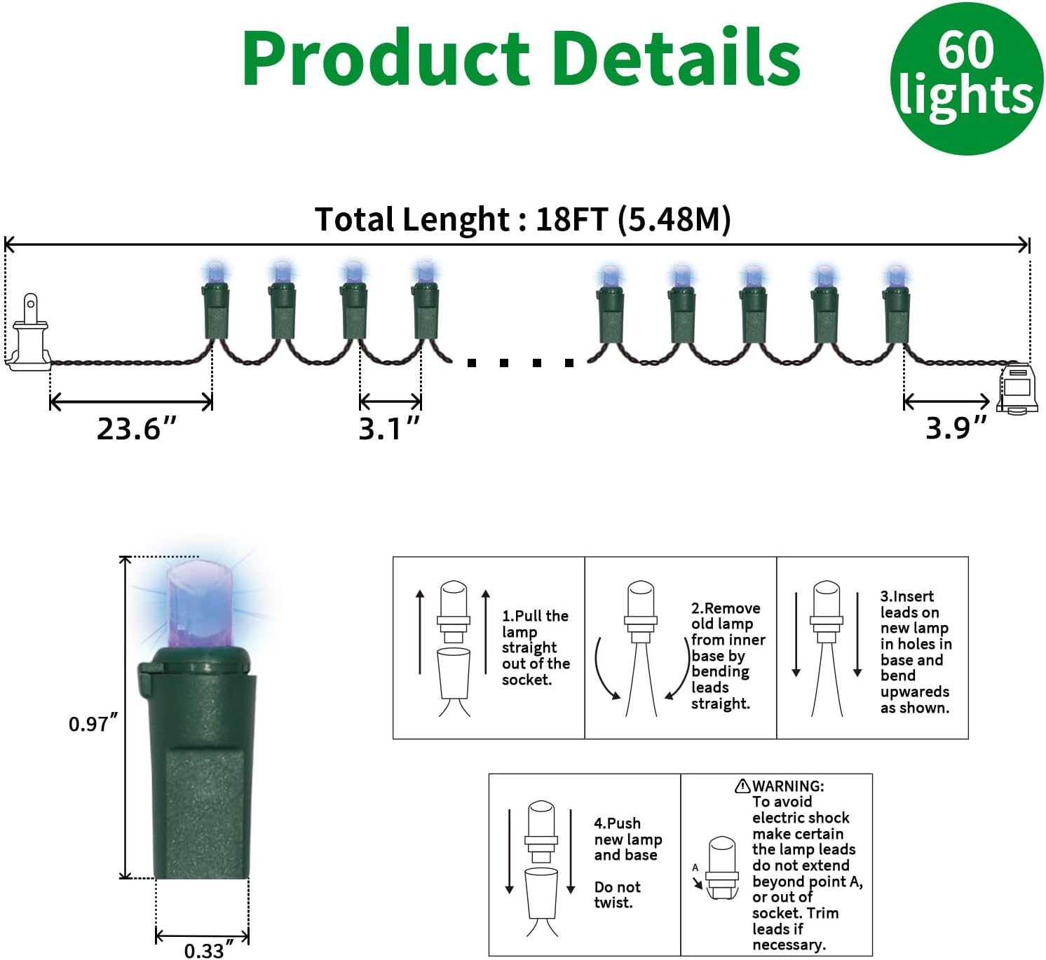 - 5mm LED Christmas Lights: 60 counts Blue 5mm wide angle stable LED string lights spaced 3.1 inches apart with green wire. 23.6 inch leads have a stackable male plug and 3.9 inch tails have a female plug for easy end to end connection.