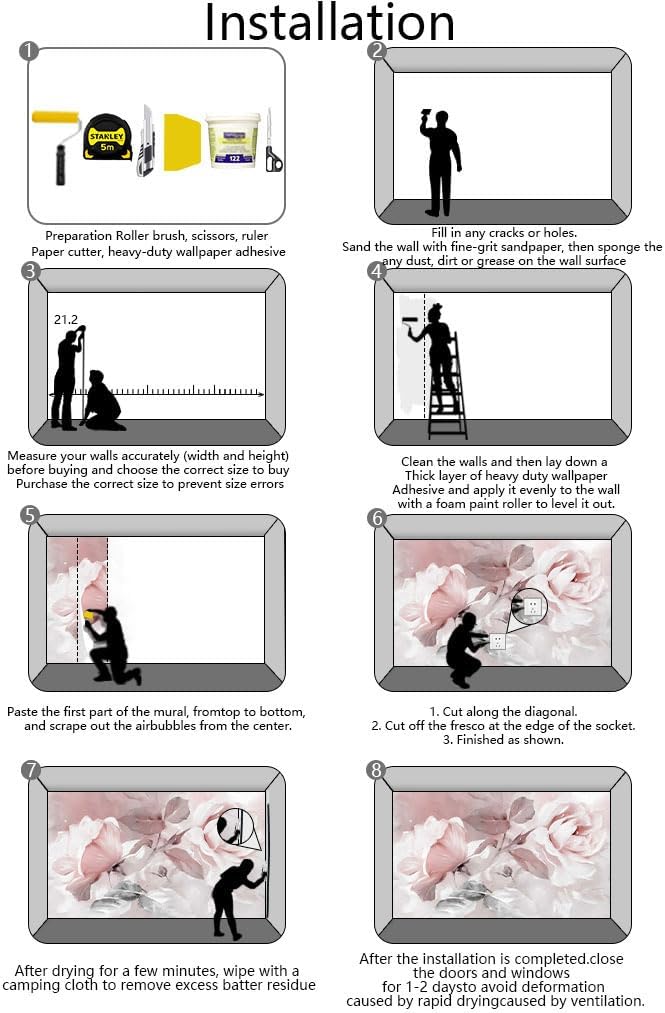 - Installation steps 1. Fill in any cracks or holes and clean the surface of the wall of dust, dirt and grease.2. Apply heavy-duty wallpaper paste to the wall, not the mural.3. Mark the position of each strip of wallpaper with a spirit level.4. Align the pattern and slide it into place.5. Scrape the bubbles with a spatula.6. Let it dry for a couple of minutes and it's ready to go!