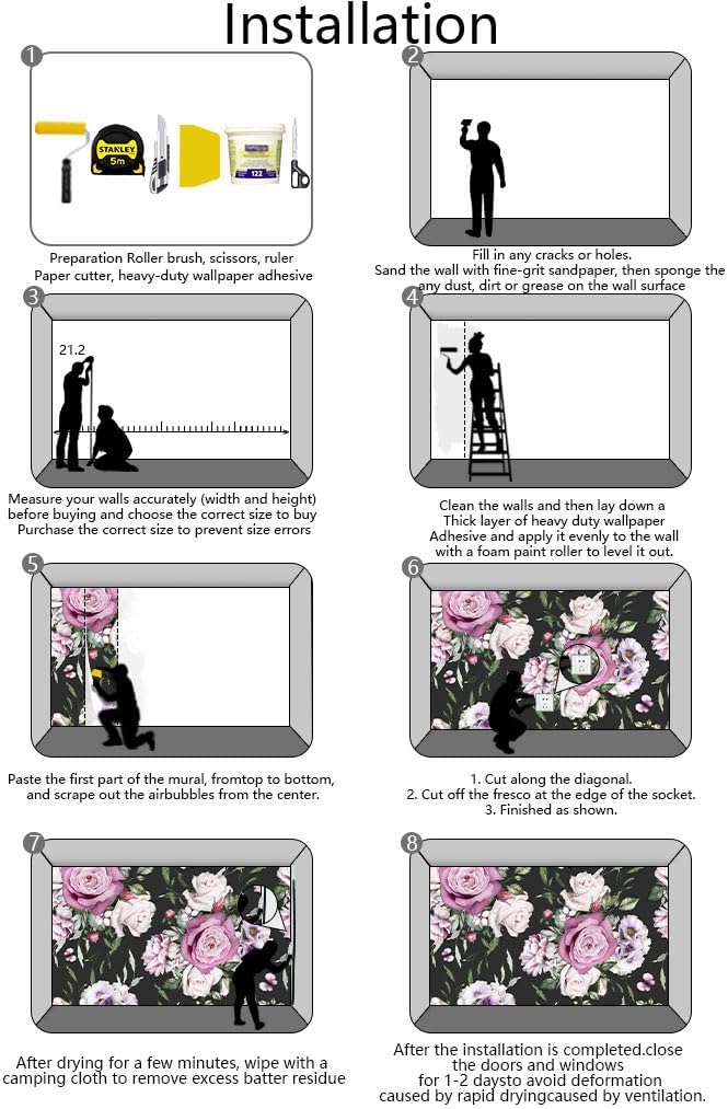 - Installation steps 1. Fill in any cracks or holes and clean the surface of the wall of dust, dirt and grease.2. Apply heavy-duty wallpaper paste to the wall, not the mural.3. Mark the position of each strip of wallpaper with a spirit level.4. Align the pattern and slide it into place.5. Scrape the bubbles with a spatula.6. Let it dry for a couple of minutes and it's ready to go!