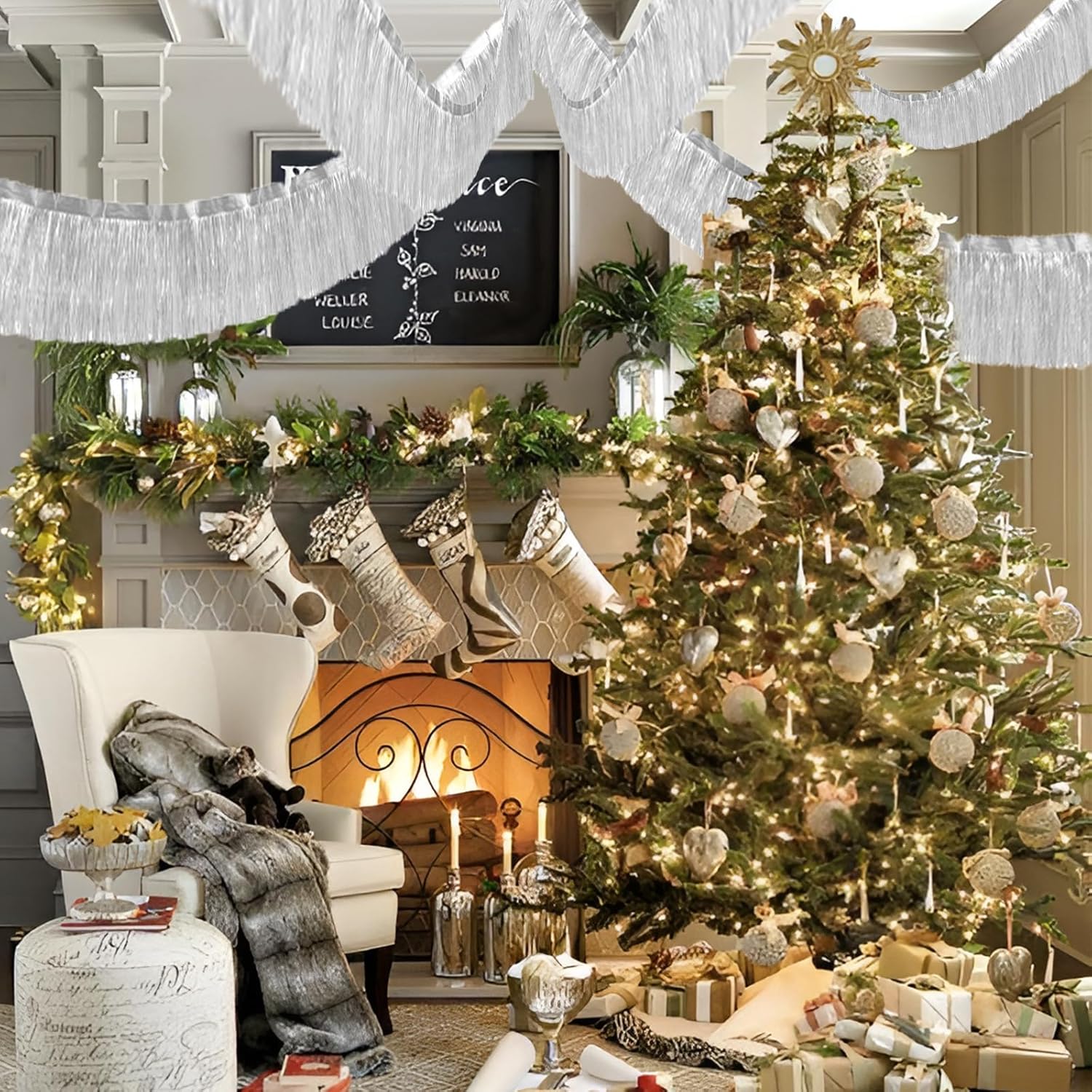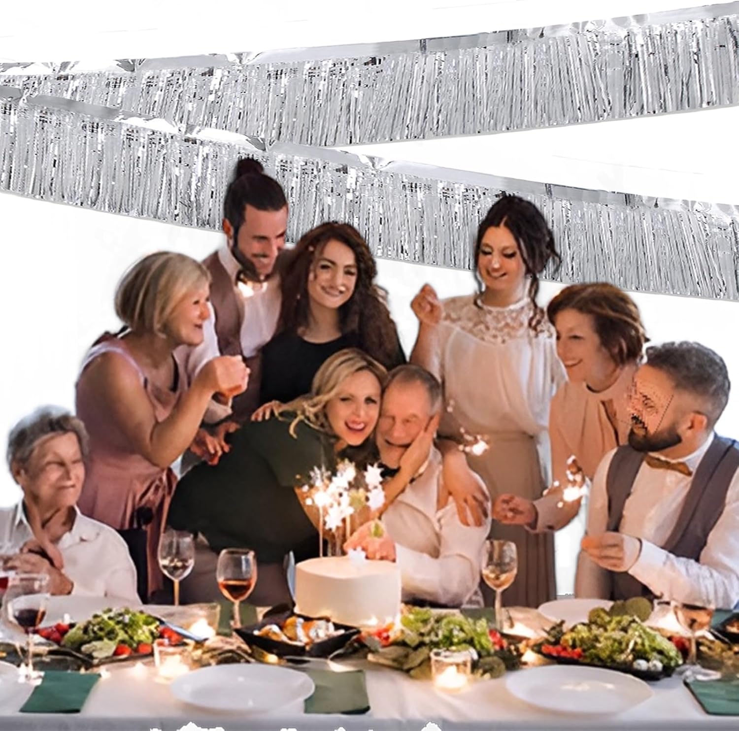 Silver Foil Fringe Garland 10FT 2packs, Metallic Foil Tinsel Fringe Banners for Parade Float Decorations Wedding, Birthday Party Graduation (Two Silver)