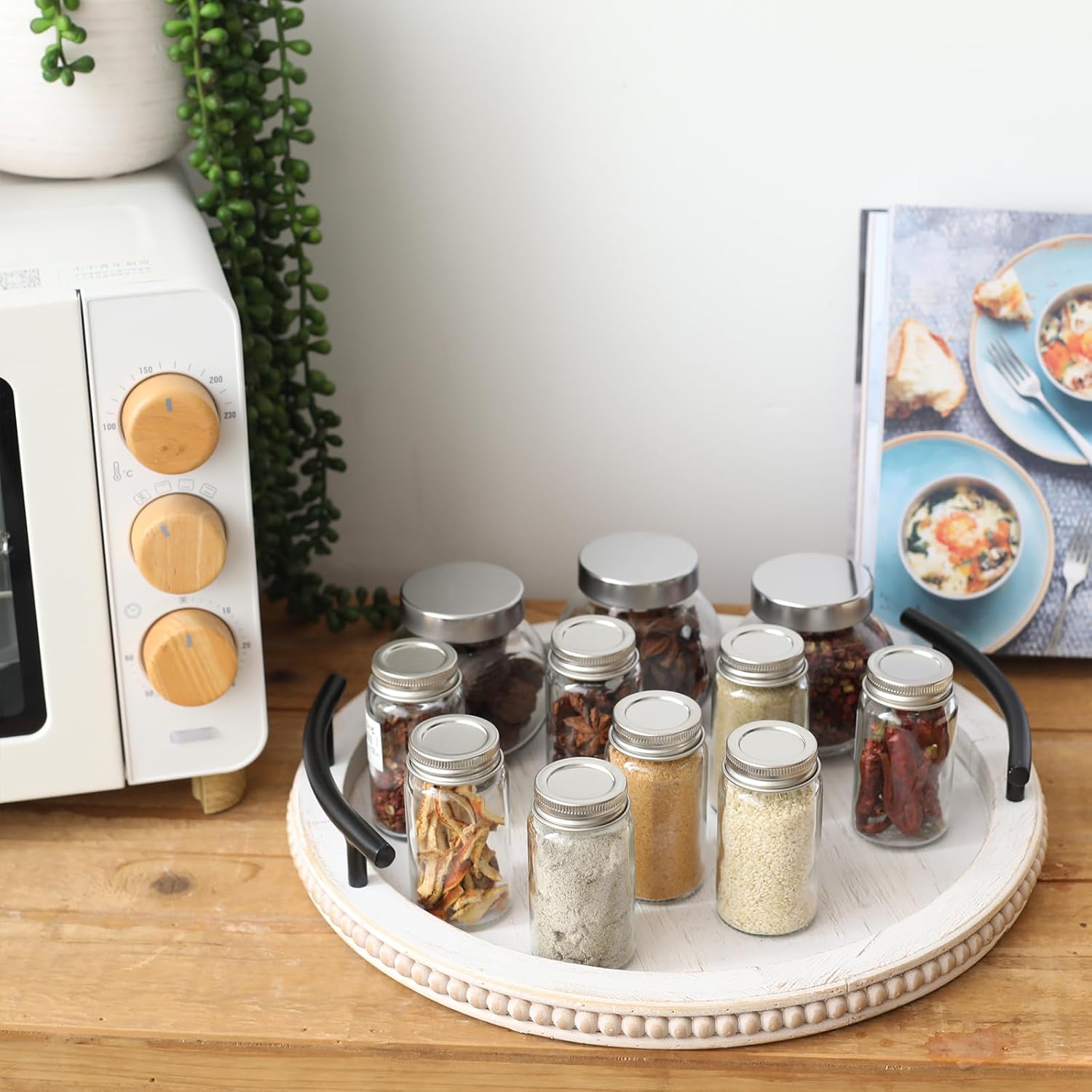 SwallowLiving White Wooden Beaded Serving Tray with Handle Decorative Rustic Whitewashed Tray for Coffee Table Farmhouse Round Tray for Kitchen, Living Room and Bedroom