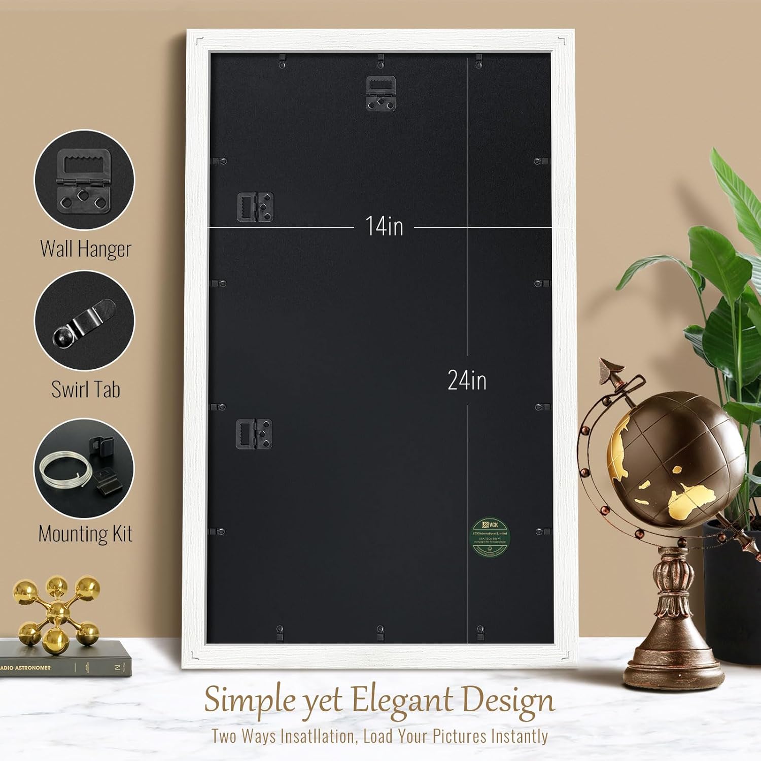- PRODUCT FEATURES: The overall size is 15.8”x25.8” for Pictures 14x24 or 24x14, horizontal/vertical for table or wall display. Unlike others, special swirl tabs make the frame super easy to load pictures.