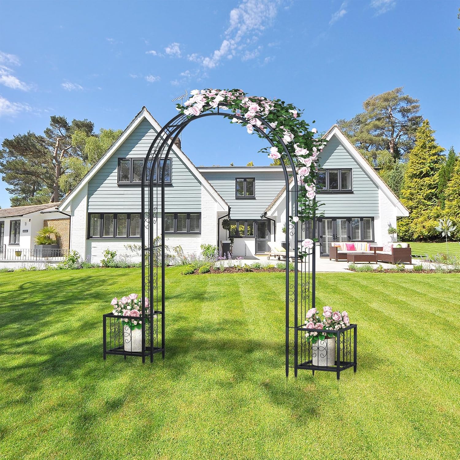 88in Steel Garden Arch Arbor Trellis with Planter Boxes for Climbing Plants Outdoor, Yard, Wide Sturdy Durable Garden Arch for Lawn,Outdoor Wedding Arch(Black)