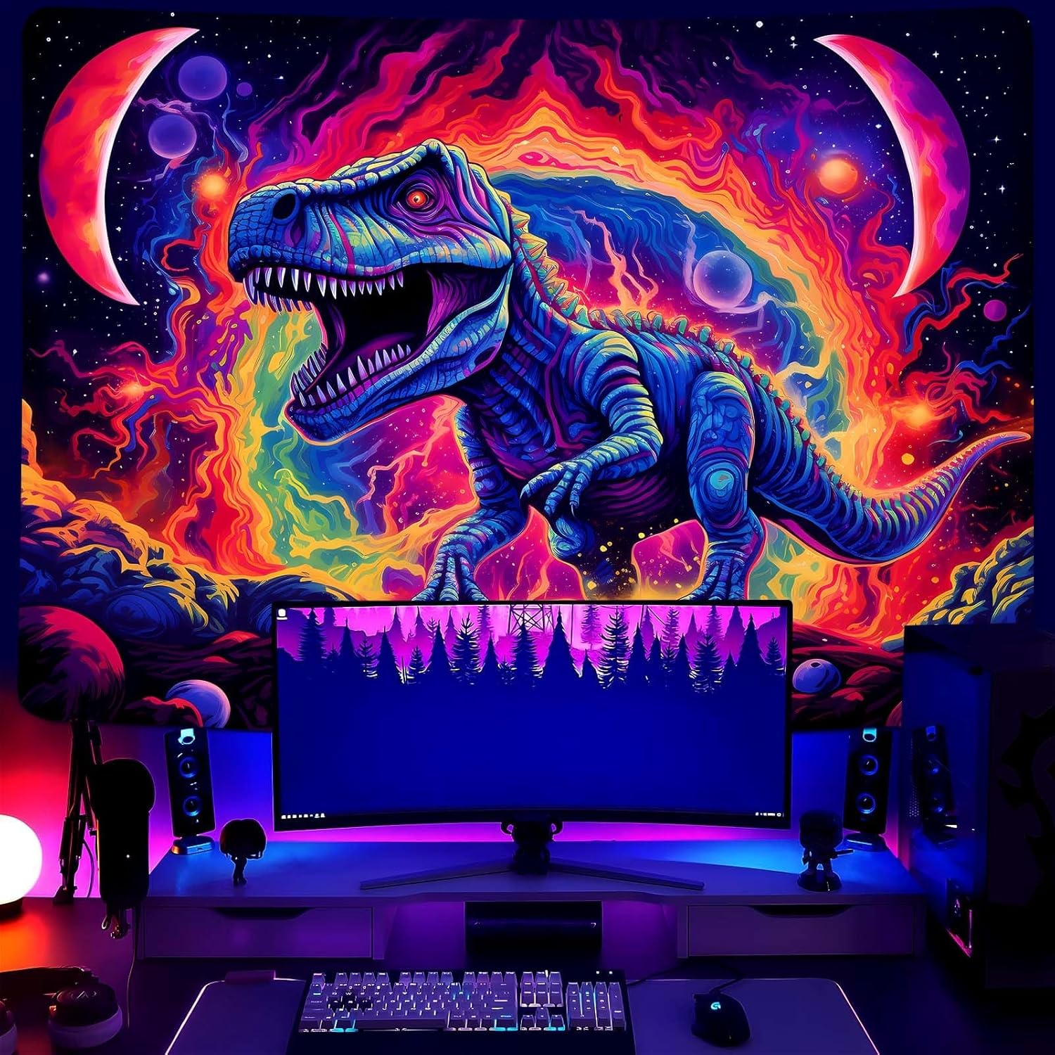 Dinosaur Wall Art, Blacklight Posters for Boys Room, UV Tapestry for Bedroom, Trippy Kids Wall Hanging, Dino Wall Decor (29x37in)