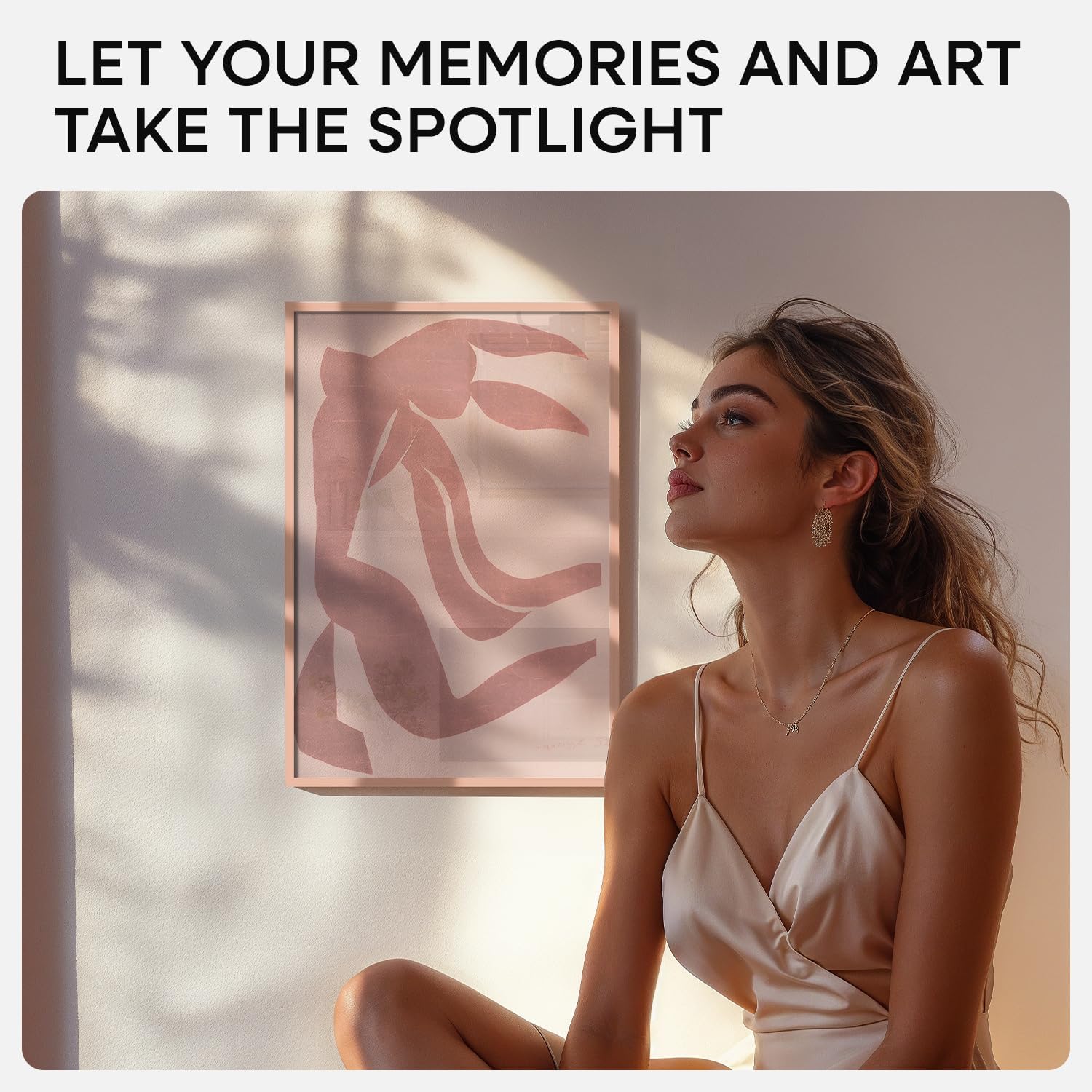 - ROSE GOLD. SOFT GLOW. This aluminum frame features a muted rose finish with a satin texture. It brings gentle contrast to light walls and softens modern interiors with a hint of warmth.