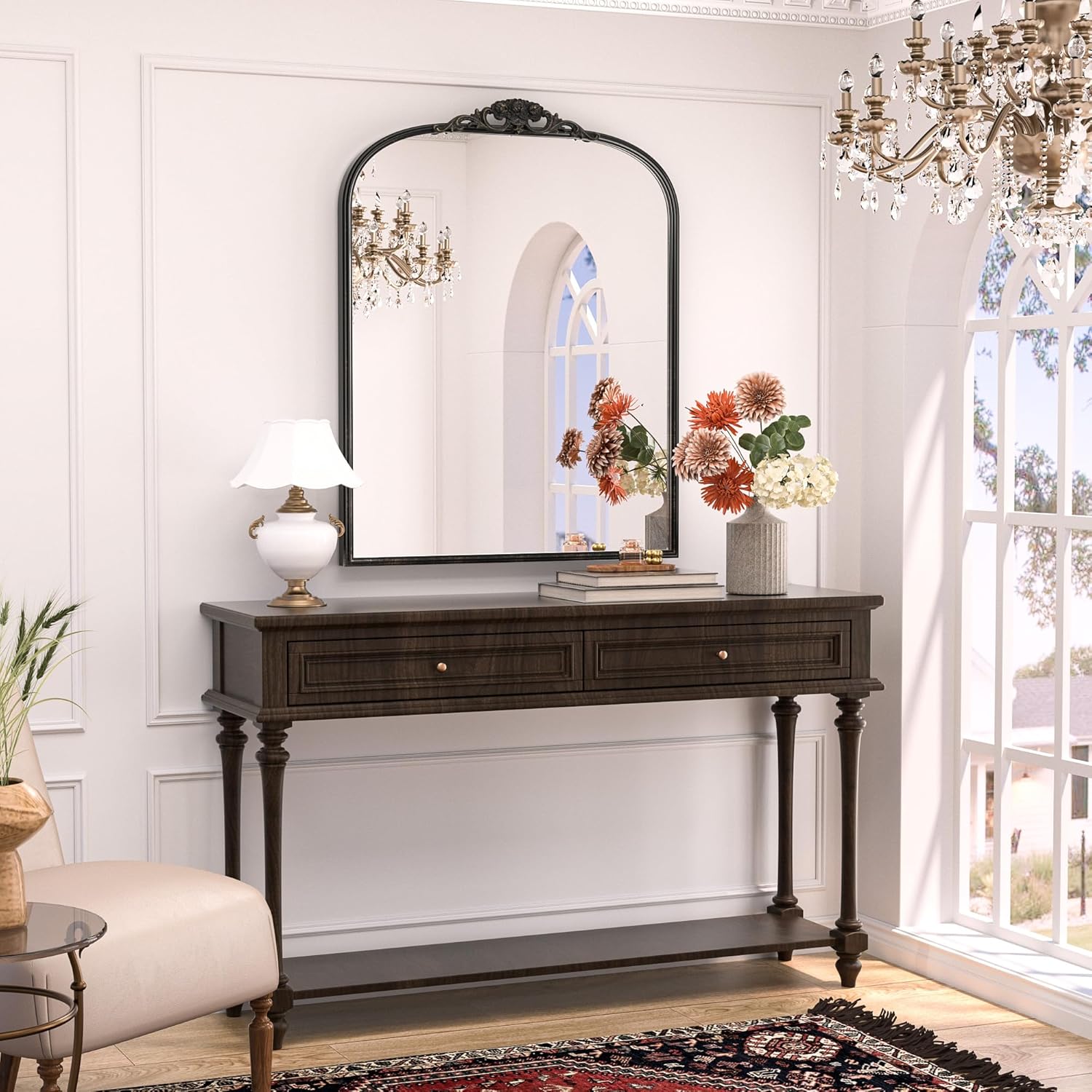 - 【Baroque-inspired Charm】 Keonjinn Black Antique Arched Mirror is a timeless piece designed to elevate your wall décor. Inspired by the opulence of the Baroque era, this mirror exudes historical charm with its graceful arched design and intricate wooden floral crown, creating a captivating focal point in any room.