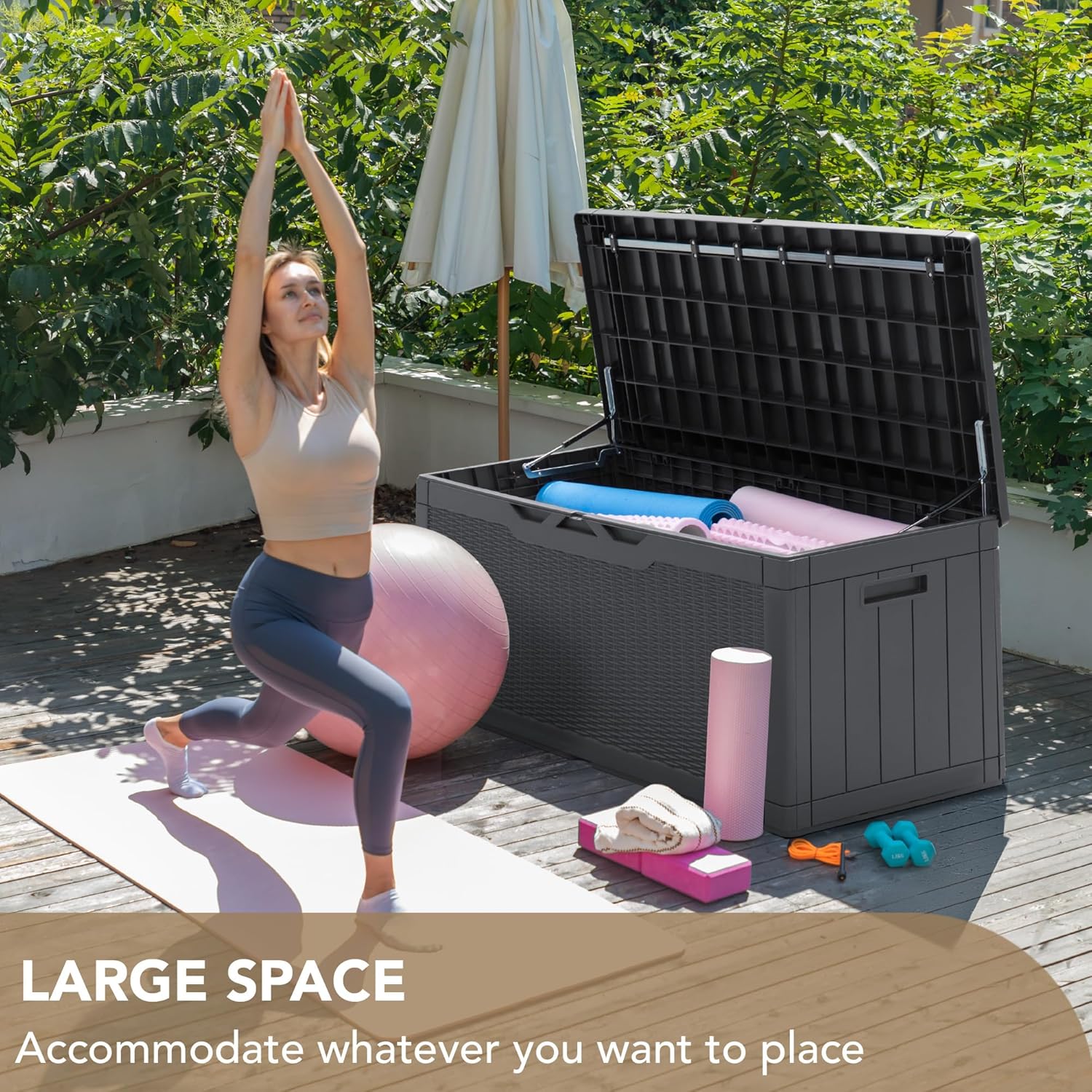 - Durable Resin Material: Deck box is made of waterproof resin, with a complementing rattan pattern design, effectively preventing fading and rusting, while also maintaining a fresh appearance even with all-weather use