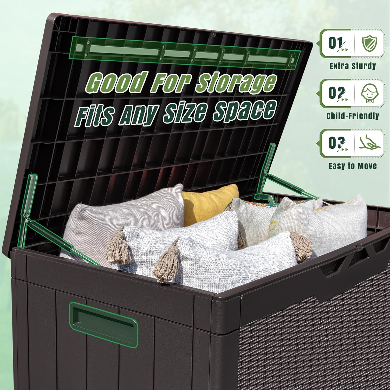 - PRACTICAL DESIGN: The deck box has a hydraulic holder design, which can prevent your hand from being caught when you open and close the box to ensure safety. Meanwhile, there is a support bar designed inside the lid, which can enhance the durability of the storage box.