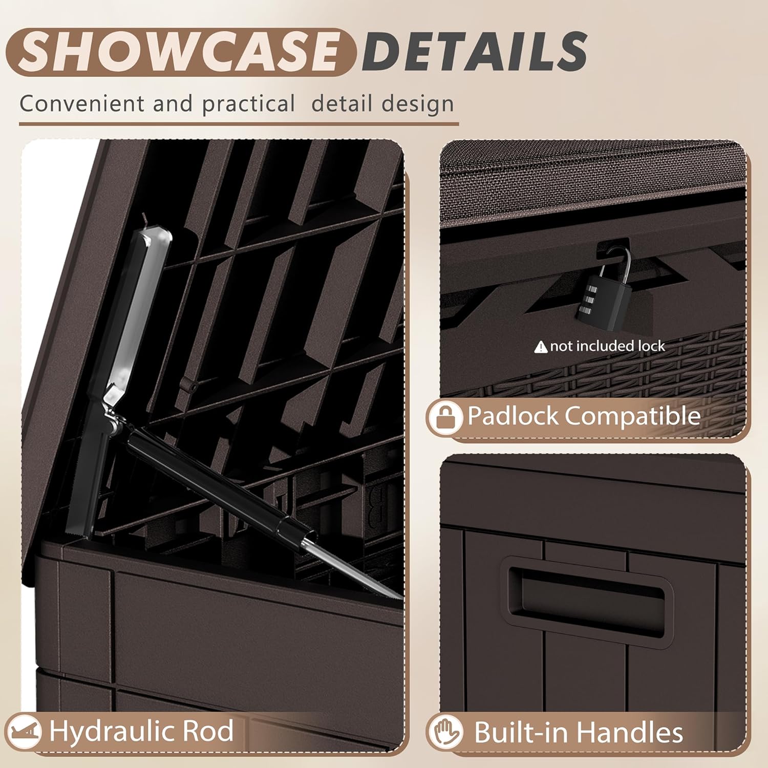 - Durable Resin Material: Deck box is made of waterproof resin, with a complementing rattan pattern design, effectively preventing fading and rusting, while also maintaining a fresh appearance even with all-weather use